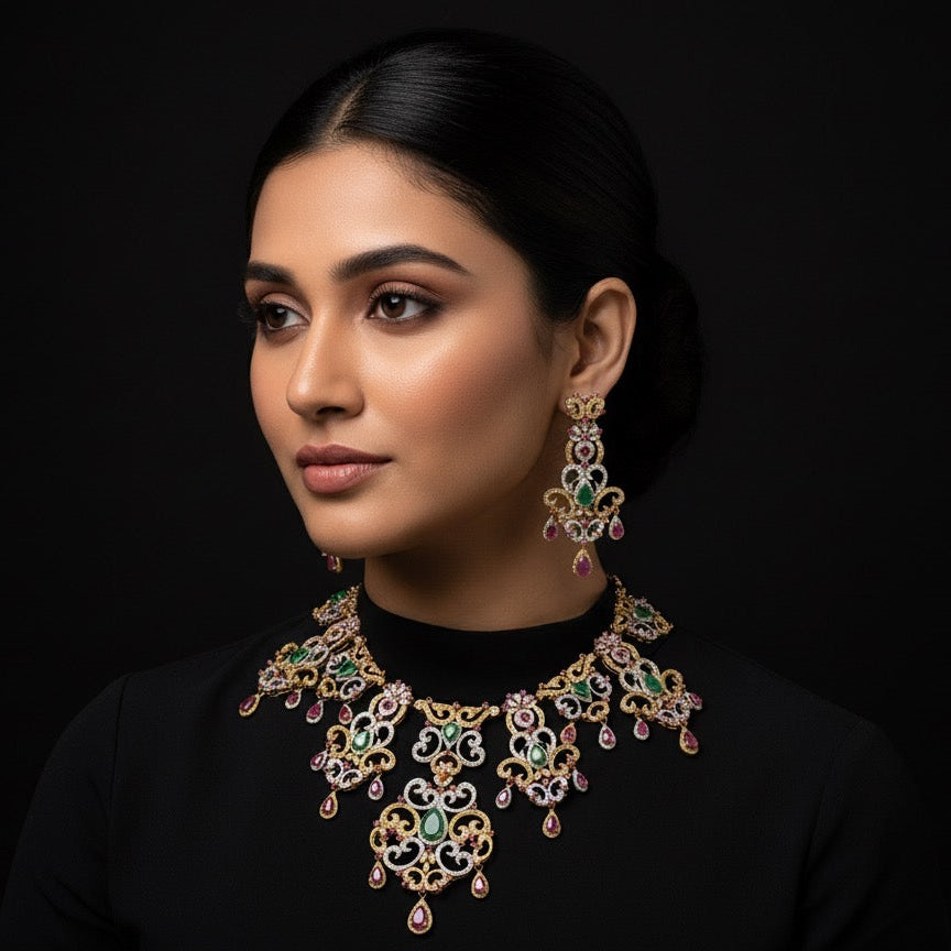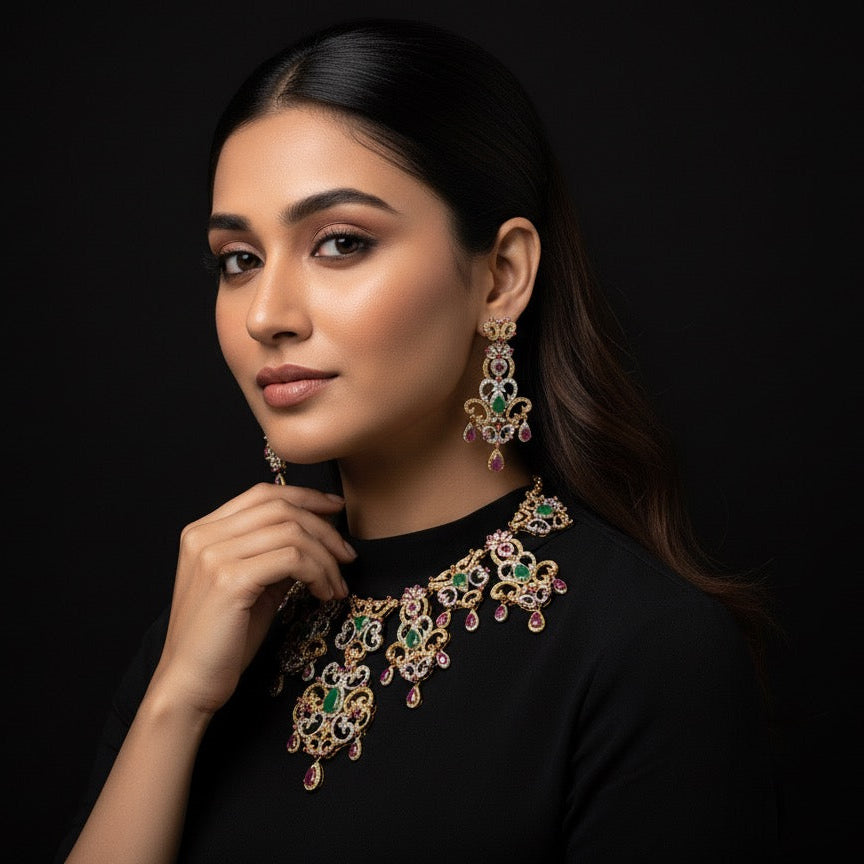 “This deluxe bridal set is expertly crafted from premium metal and finished with a rich gold-chrome polish. Intricately embellished with sparkling zircons, vibrant green emerald tones, and elegant pink ruby accents, it radiates pure luxury—perfect for creating a regal, statement bridal look.”