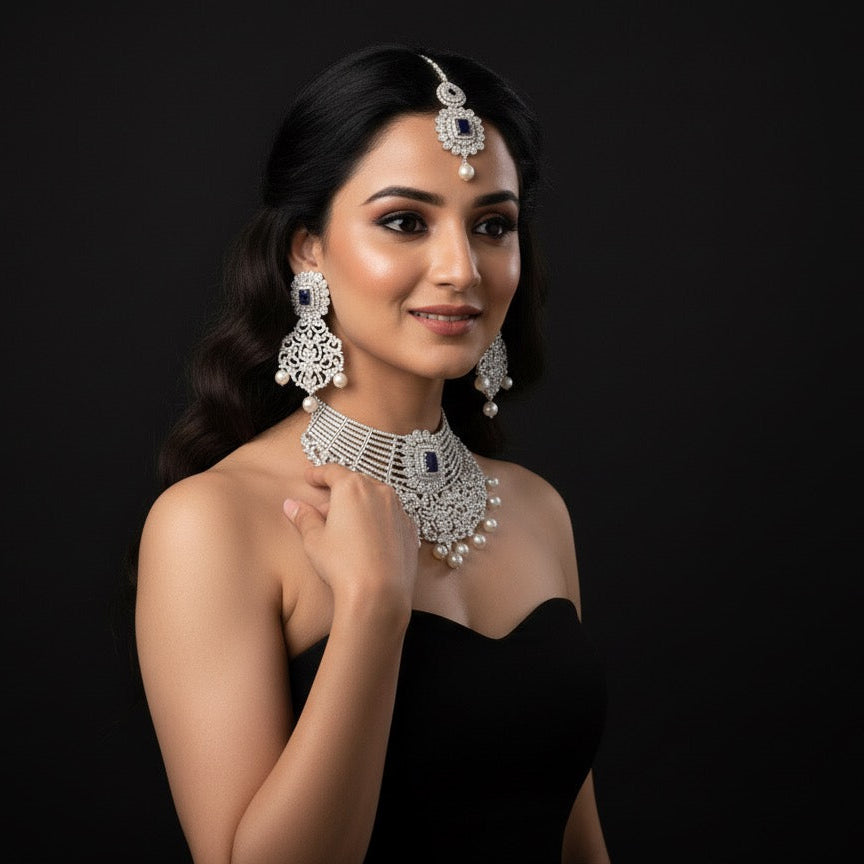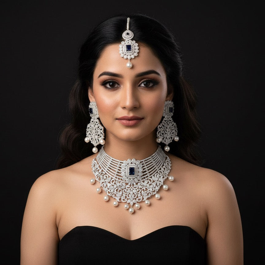 “This exquisite designer bridal set is crafted from high-quality metal and adorned with shimmering zircons, featuring a captivating deep-blue sapphire at its center. Designed to elevate your bridal look, this set adds a touch of timeless royalty and unmatched elegance. Perfect for your wedding day, it ensures you look truly regal the moment you wear it.”