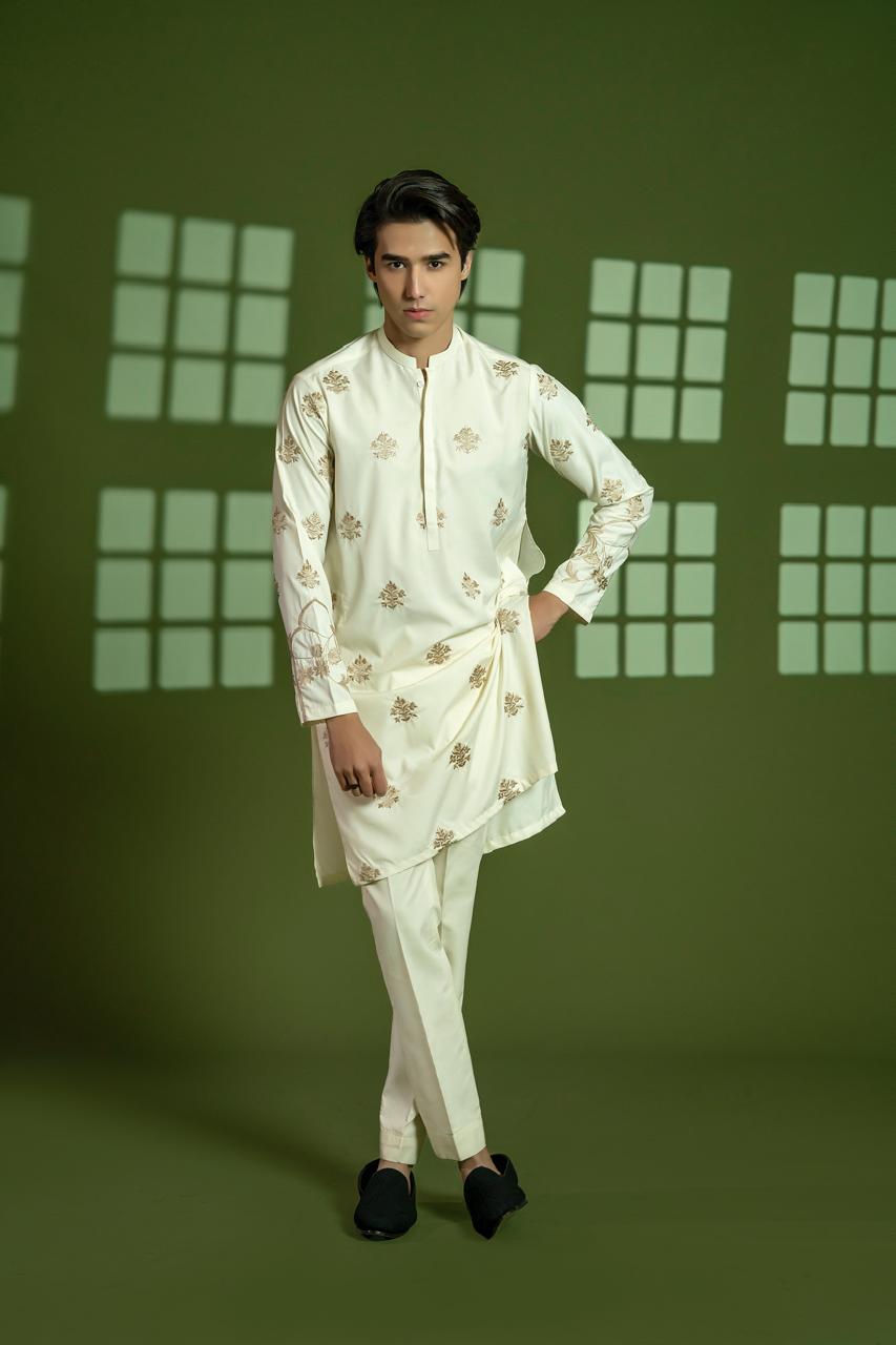The outfit features a cream-colored wash-and-wear kurta, adorned with intricate beige floral embroidery that adds a touch of elegance. It is paired with fitted cream-colored trousers that have a subtle sheen, creating a cohesive and stylish look. This outfit is ideal for casual wear, Eid celebrations, or any festive event, offering both comfort and sophistication.