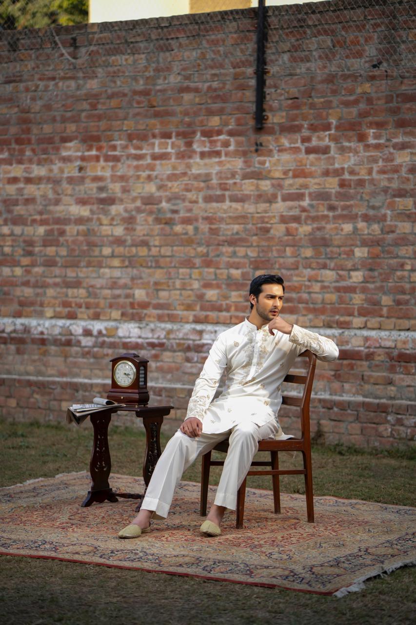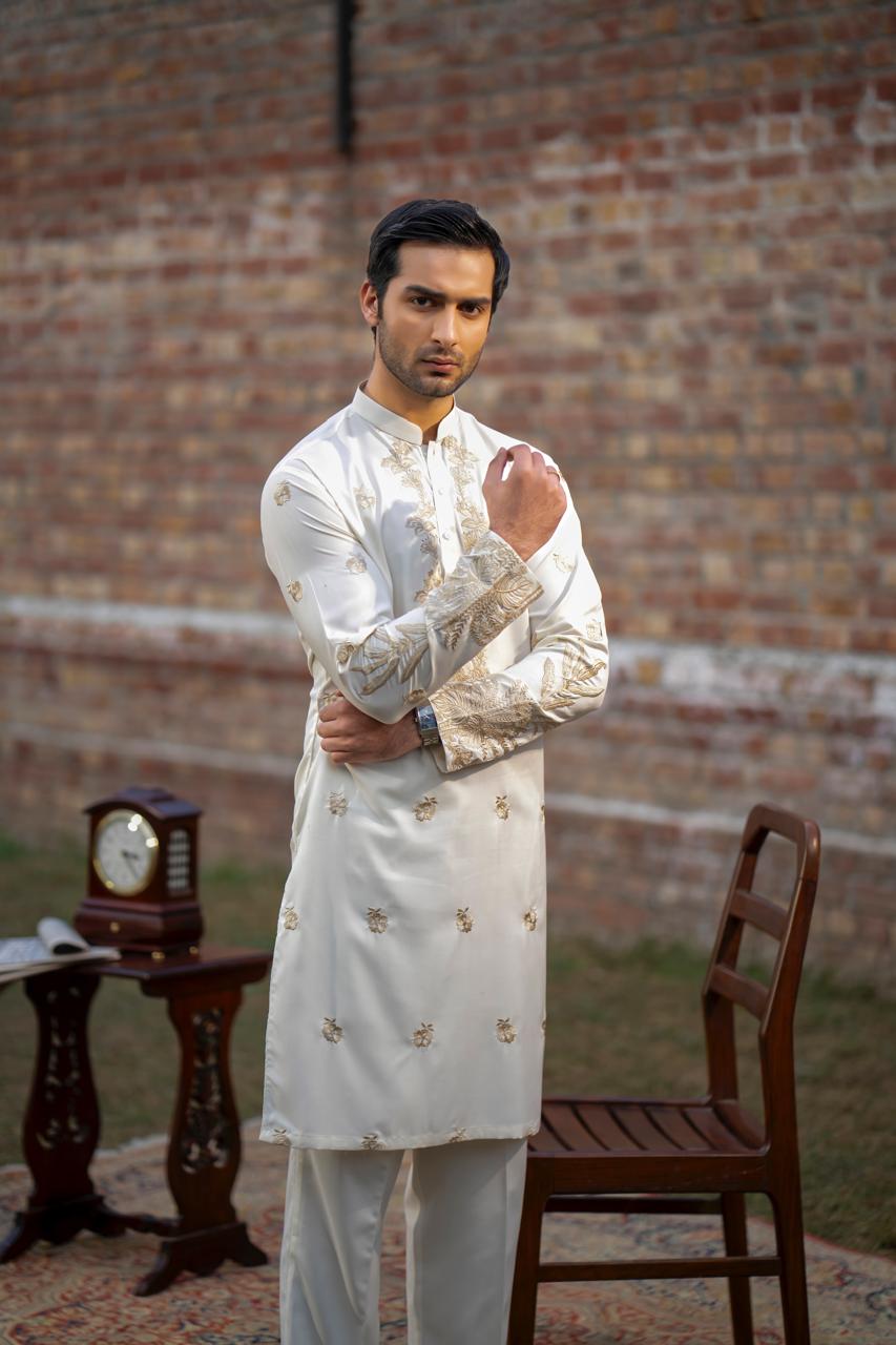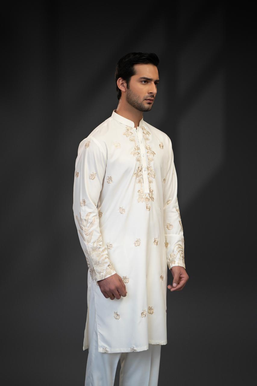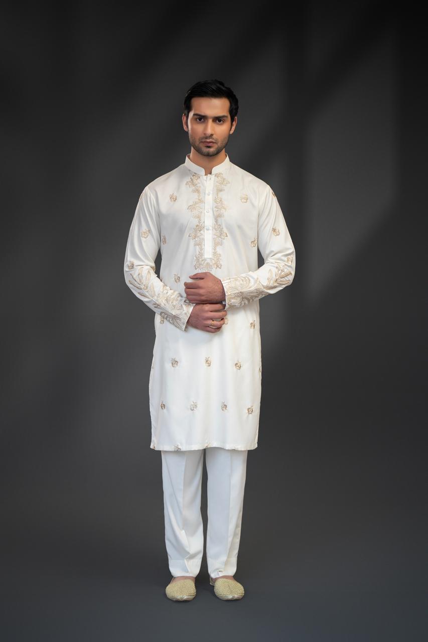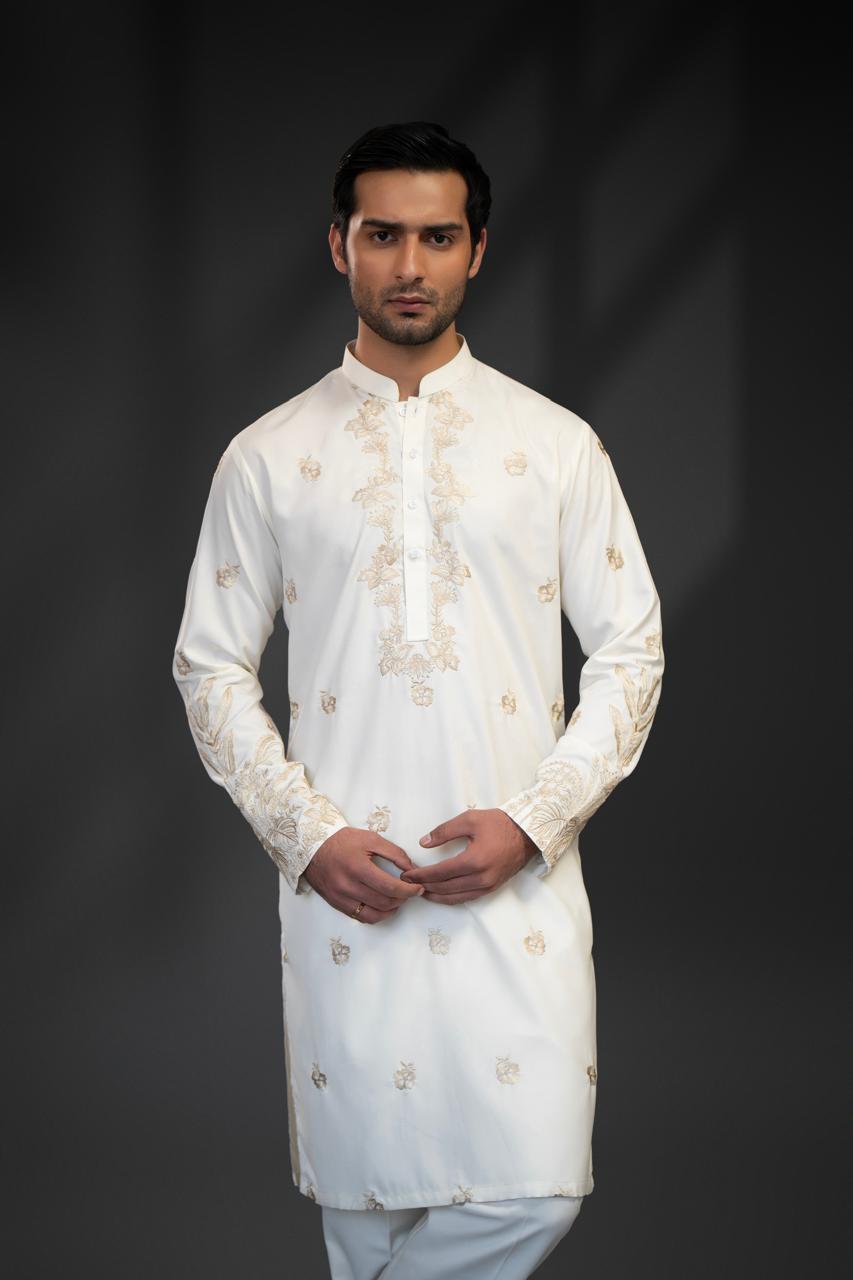 Cream-colored wash&wear premium fabric kurta, beautifully embroidered with beige thread, featuring a delicately designed neckline and subtle boti spray detailing across the shirt. Paired with a sleek plain straight trouser, creating a perfectly balanced and graceful silhouette, ideal for festive and formal wear.
