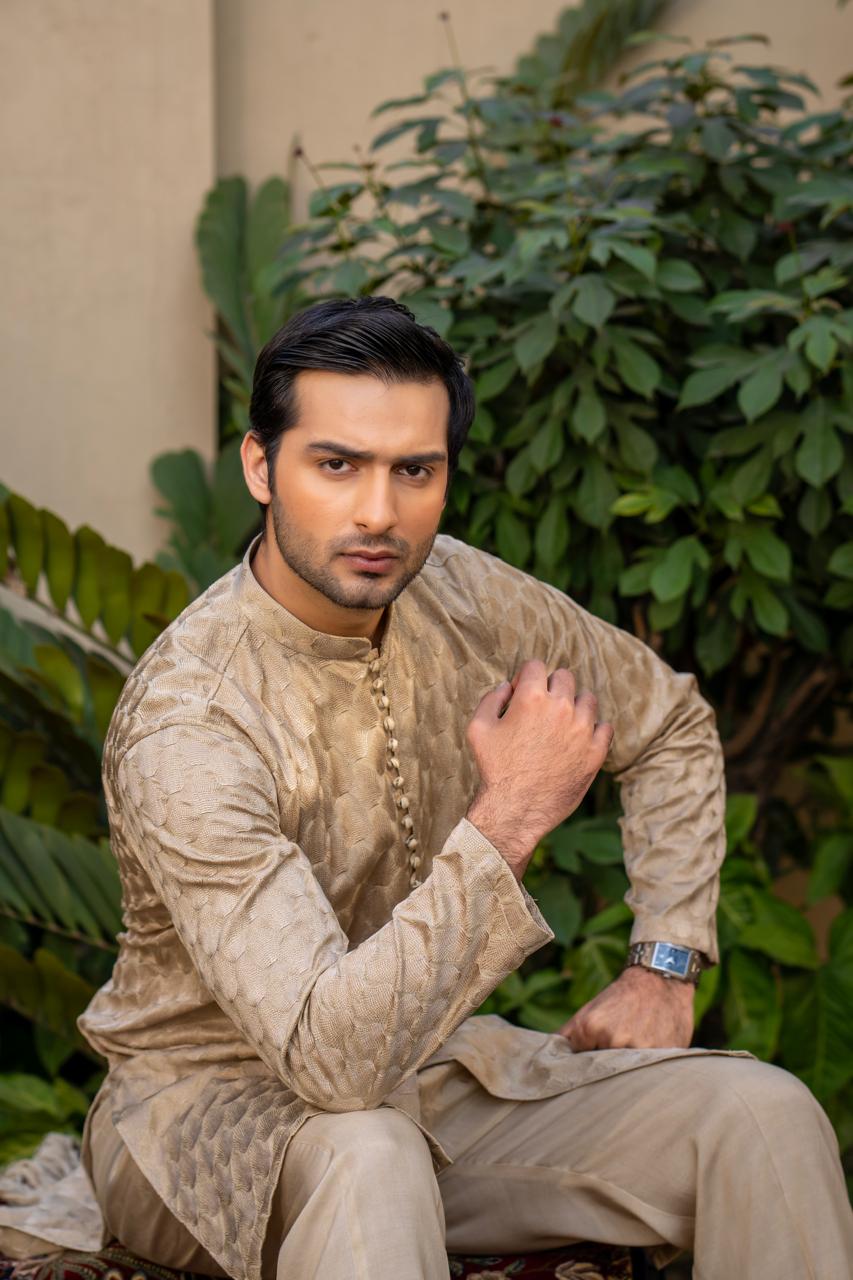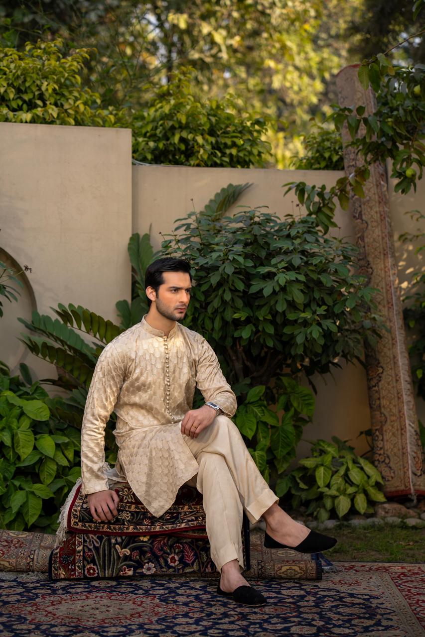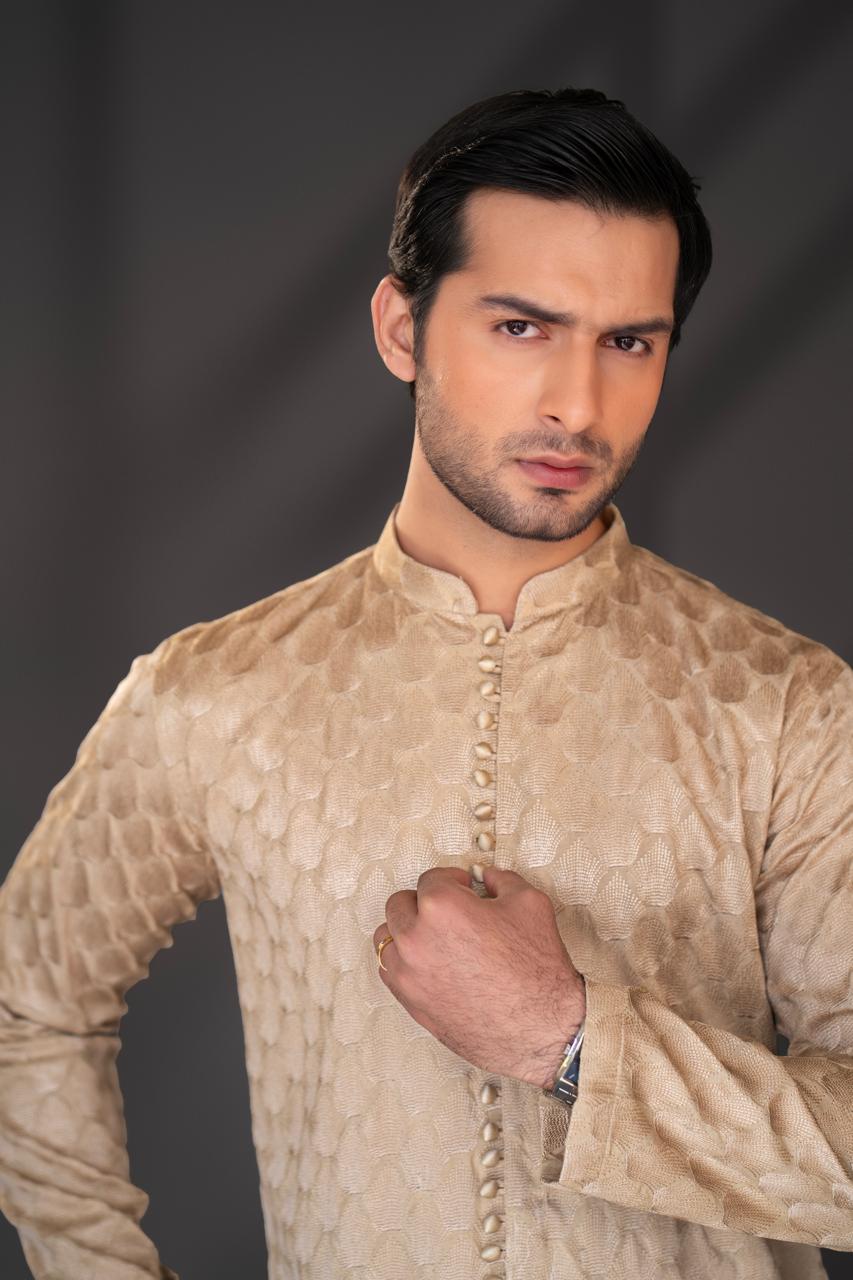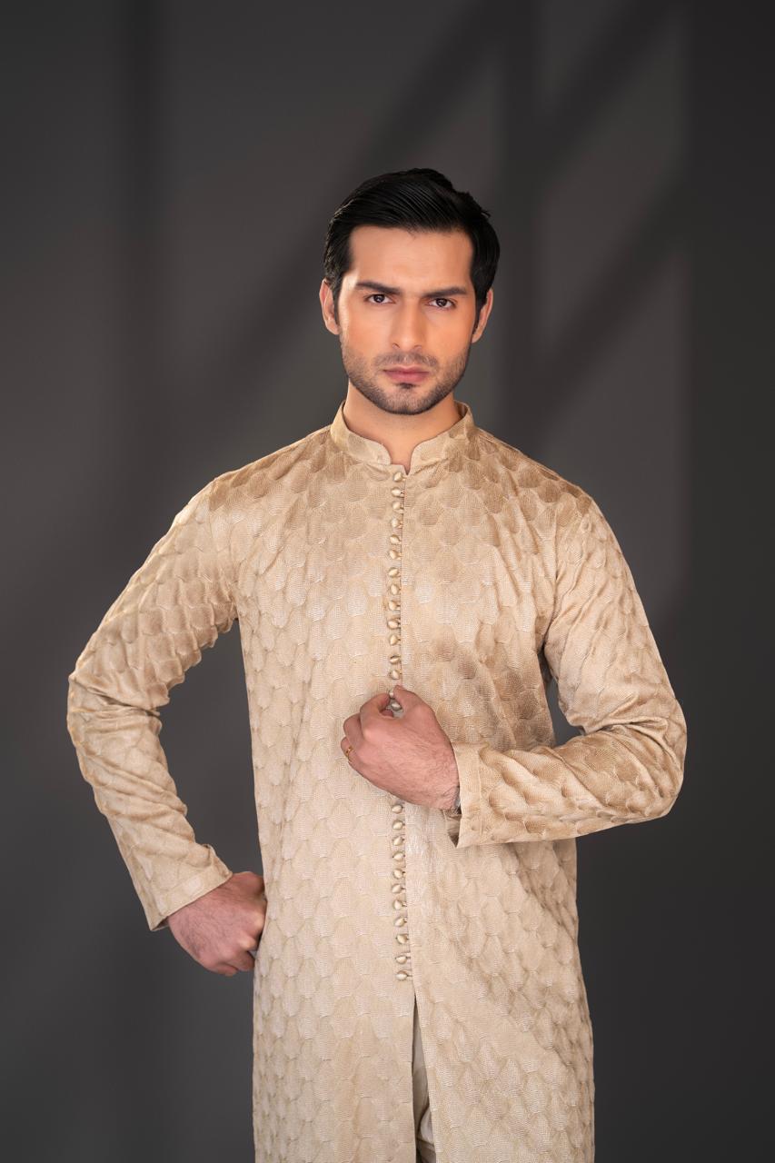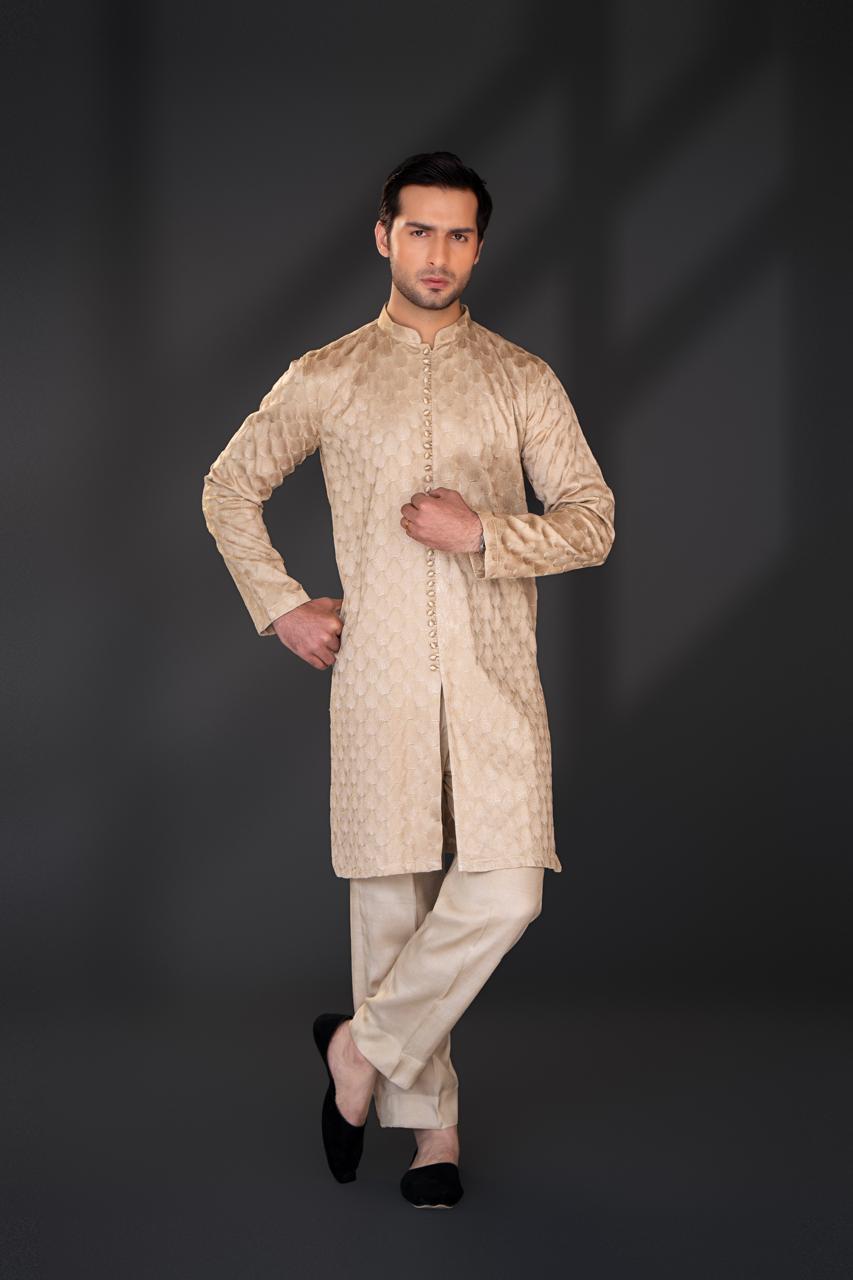 This silk fabric kurta pajama is crafted in a warm beige tone with luxurious same-color embroidery, giving it a rich and elegant appeal. The kurta features a sleek band collar, a neat front button placket with fabric-covered buttons, and a straight, tailored cut with full sleeves that creates a refined silhouette. It is paired with a matching light beige straight pajama, completing the coordinated and graceful look. Overall, this outfit reflects a sophisticated, royal aesthetic, making it an ideal choice for weddings, Eid, festive occasions, and formal gatherings.