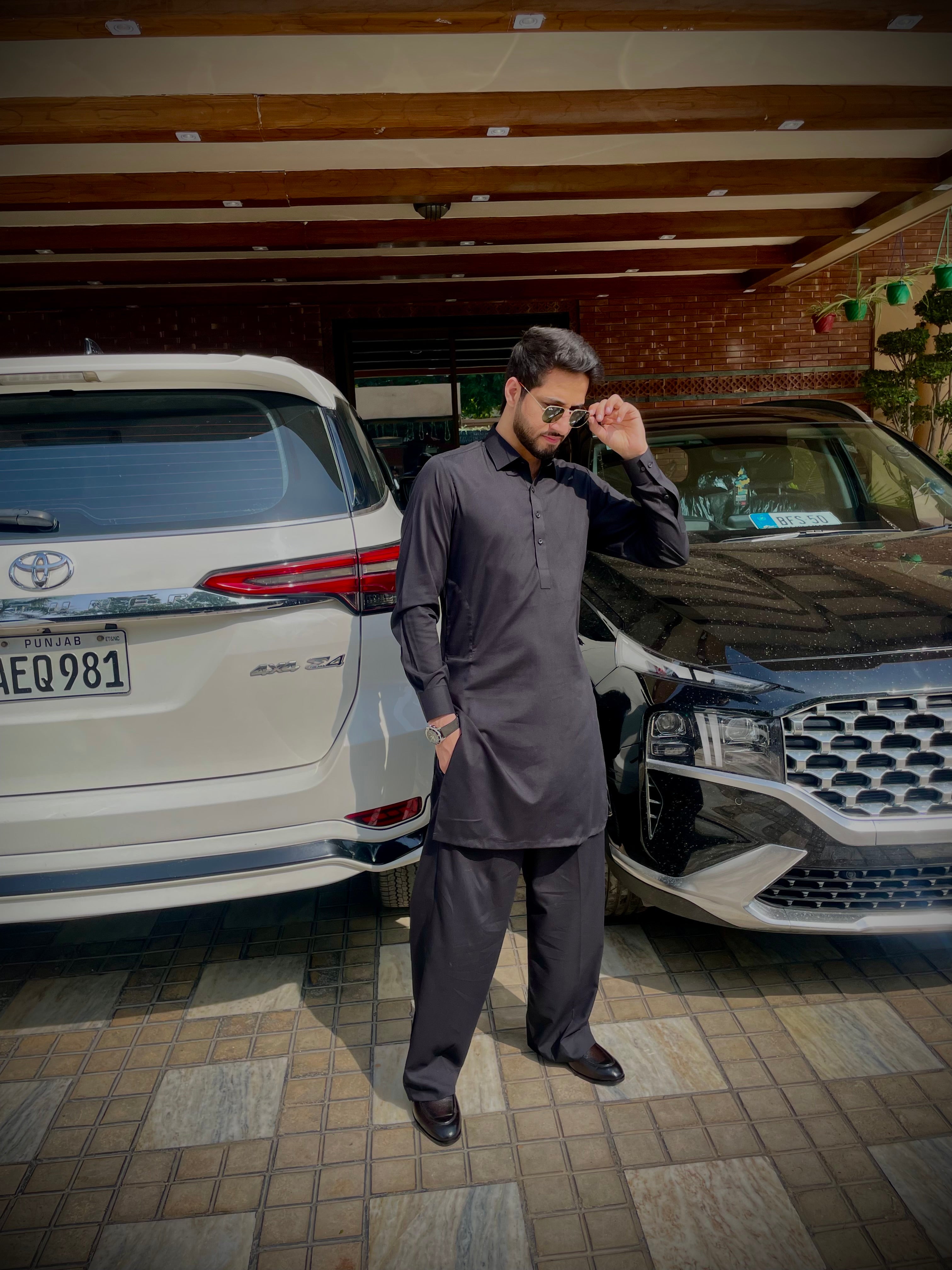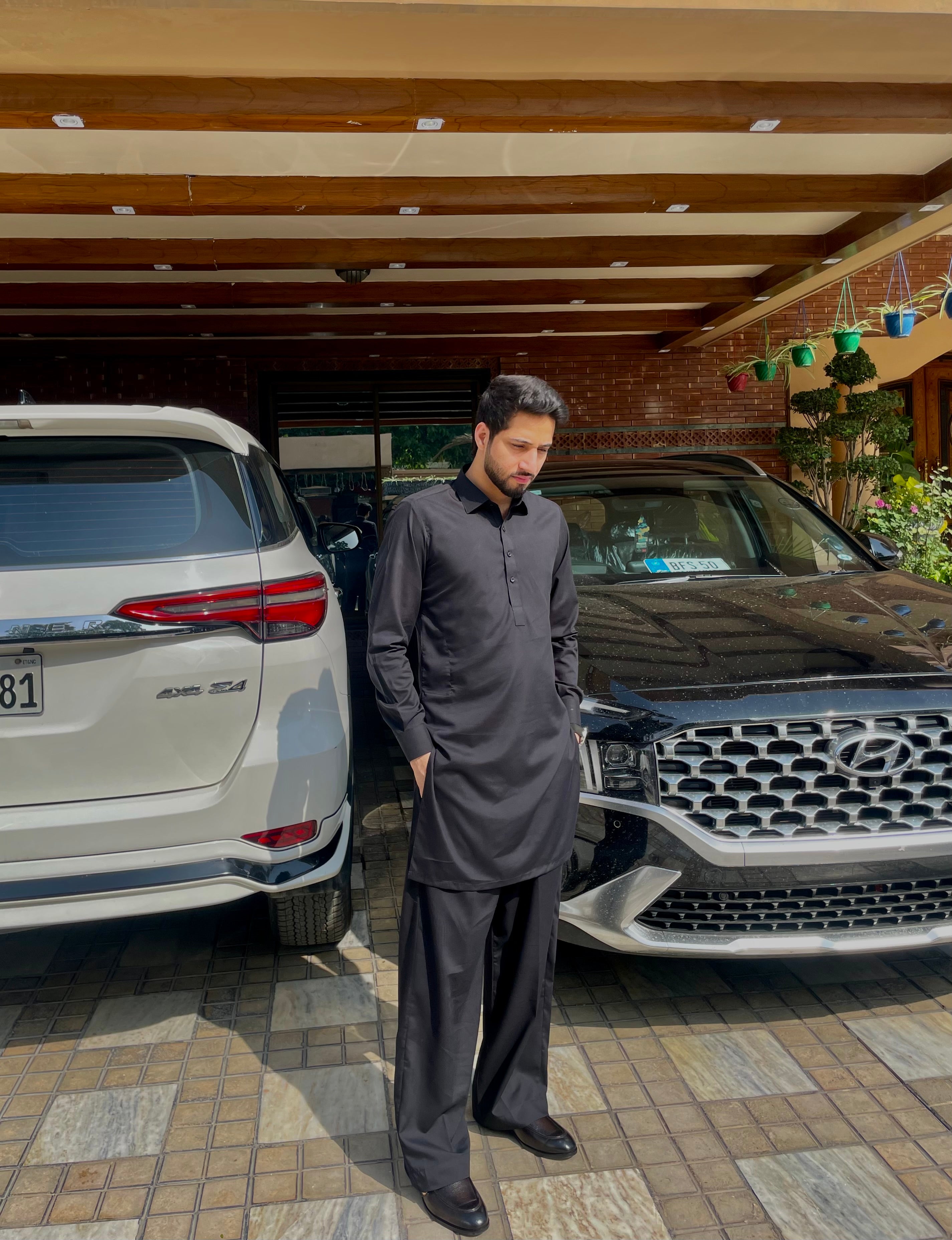 Black wash & wear fabric qameez with a sleek French collar and cuff detailing
