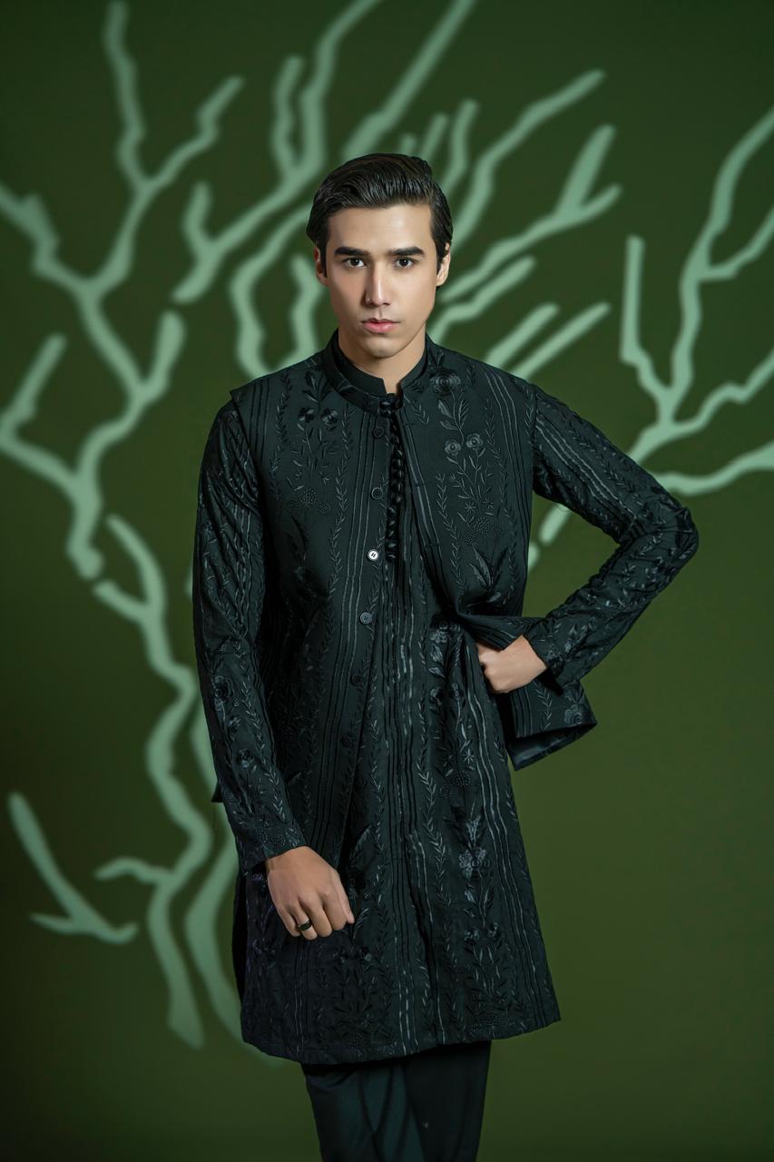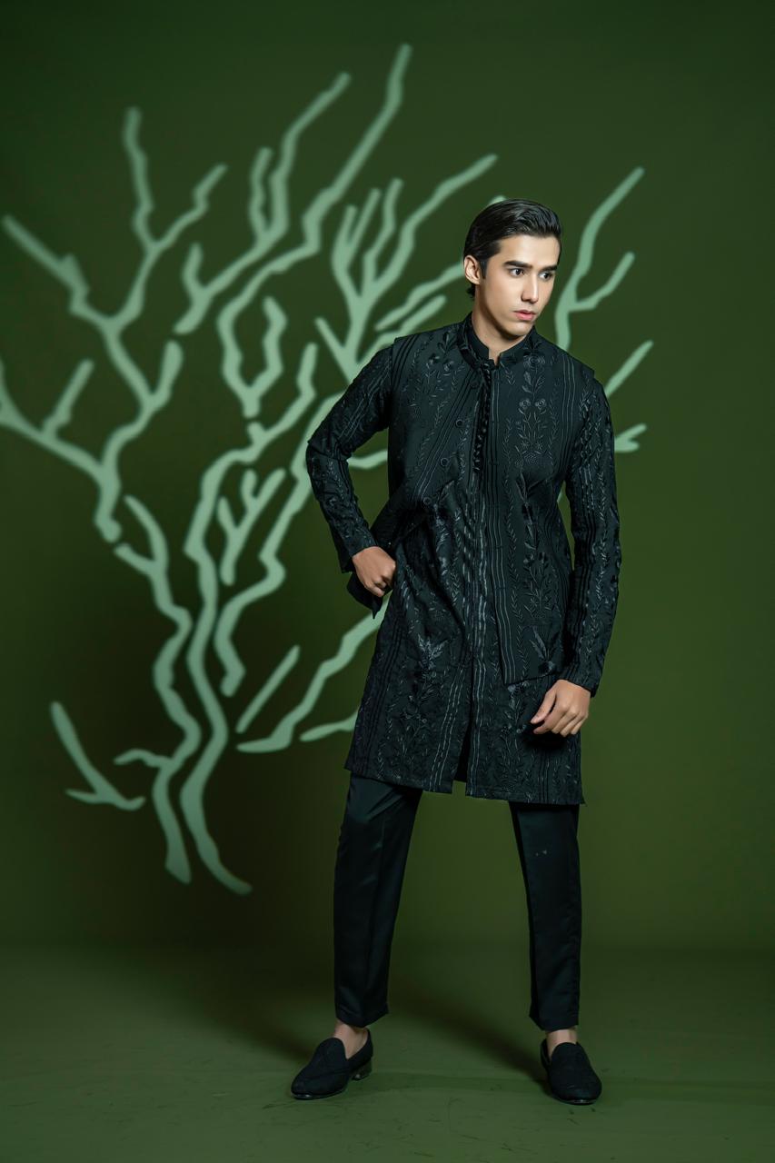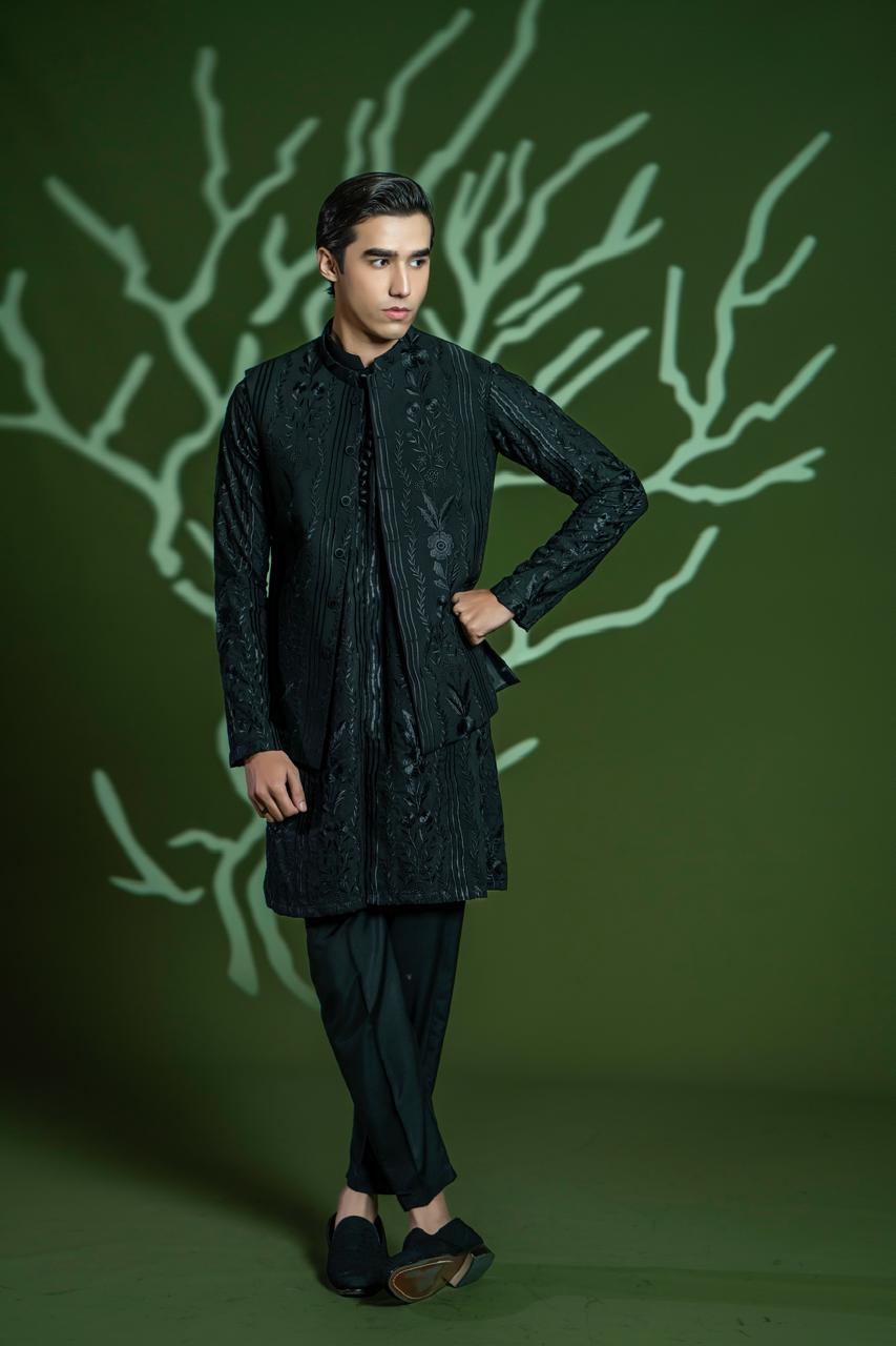 This black blended wash-and-wear fabric outfit sounds stunning! The elegant floral embroidery pattern adds a touch of sophistication and uniqueness to the piece, making it stand out. The open waistcoat and kurta design, especially with the half-front opening and decorative loop buttons, certainly gives it a contemporary flair that merges tradition with modern style.