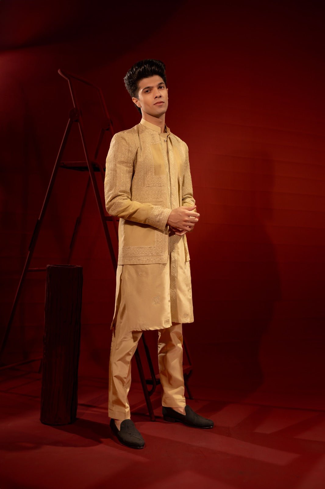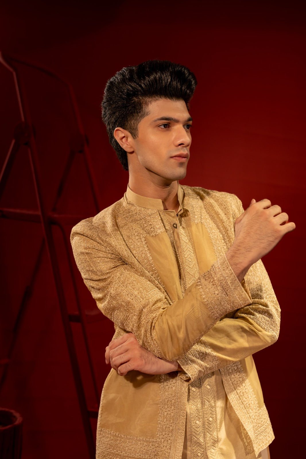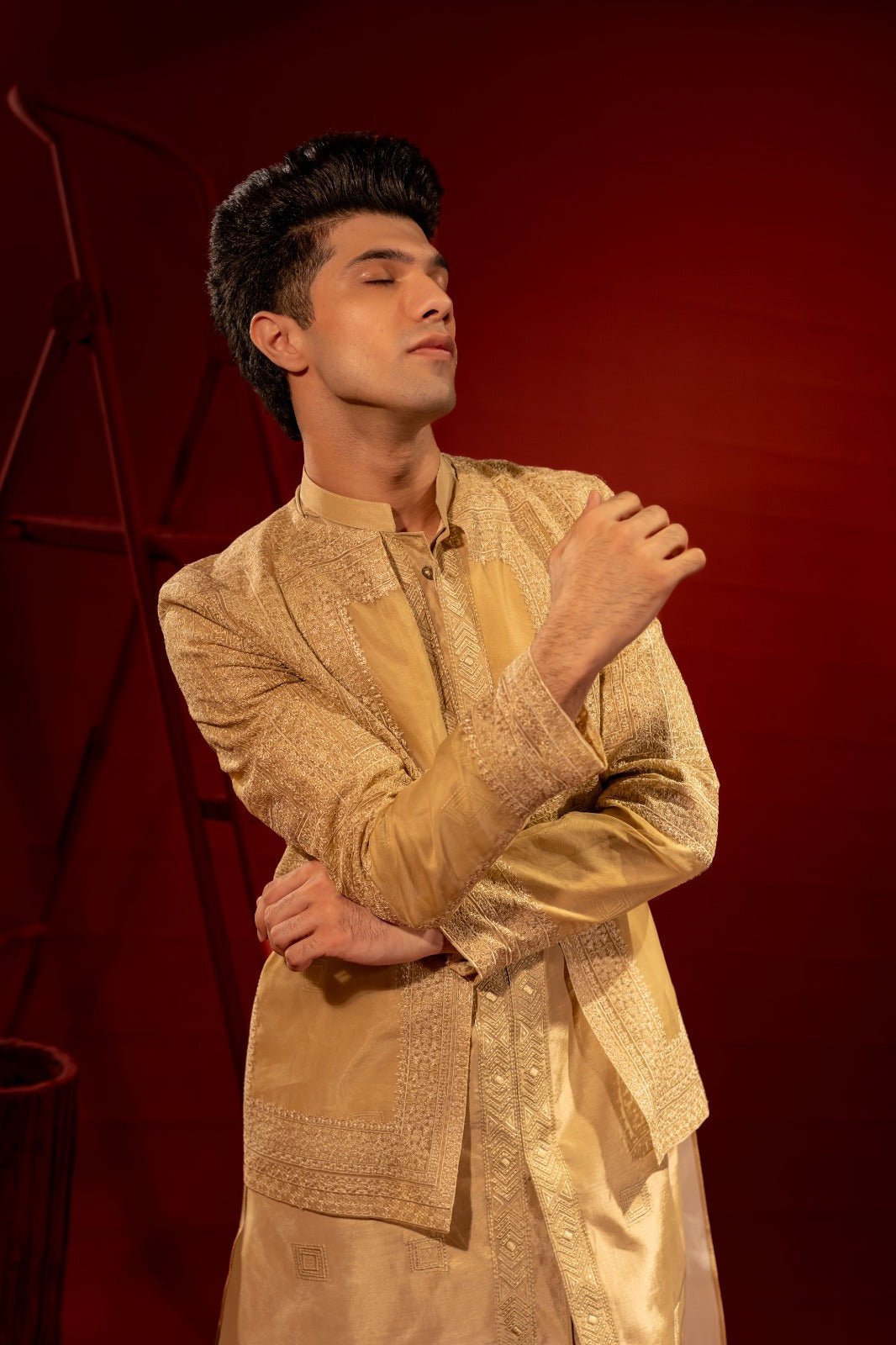 Crafted from lightweight, sheer organza for an ethereal and sophisticated appearance. Adorned with meticulously crafted thread embroidery that enhances its aesthetic appeal. The embroidery may feature intricate geometric designs paired with A golden silk half front open kurta pajama with embroidery in a modern pattern using the same color thread would make for an elegant outfit suitable for festive occasions, weddings, or cultural celebrations.