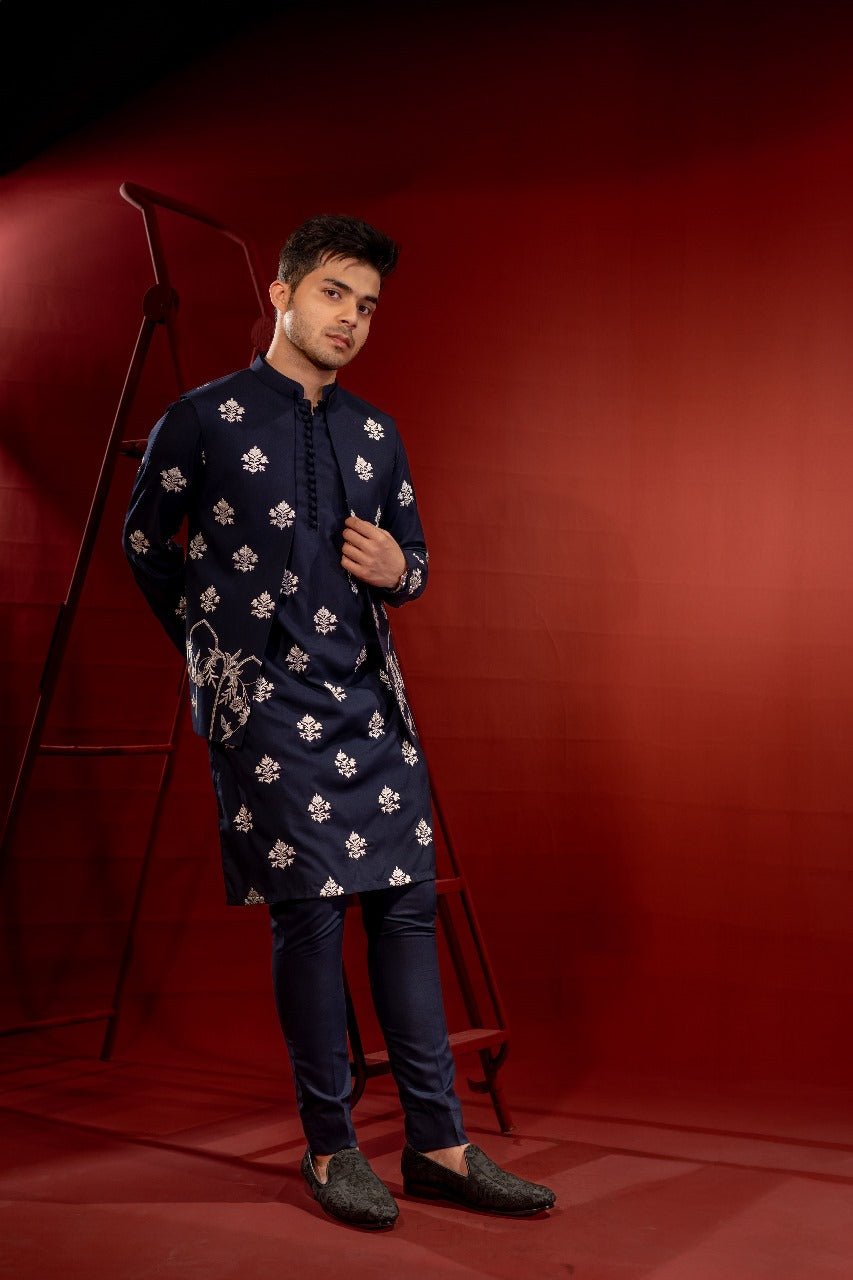navy blue waistcoat kurta pajama adorned with intricate white floral embroidery, giving it an elegant look