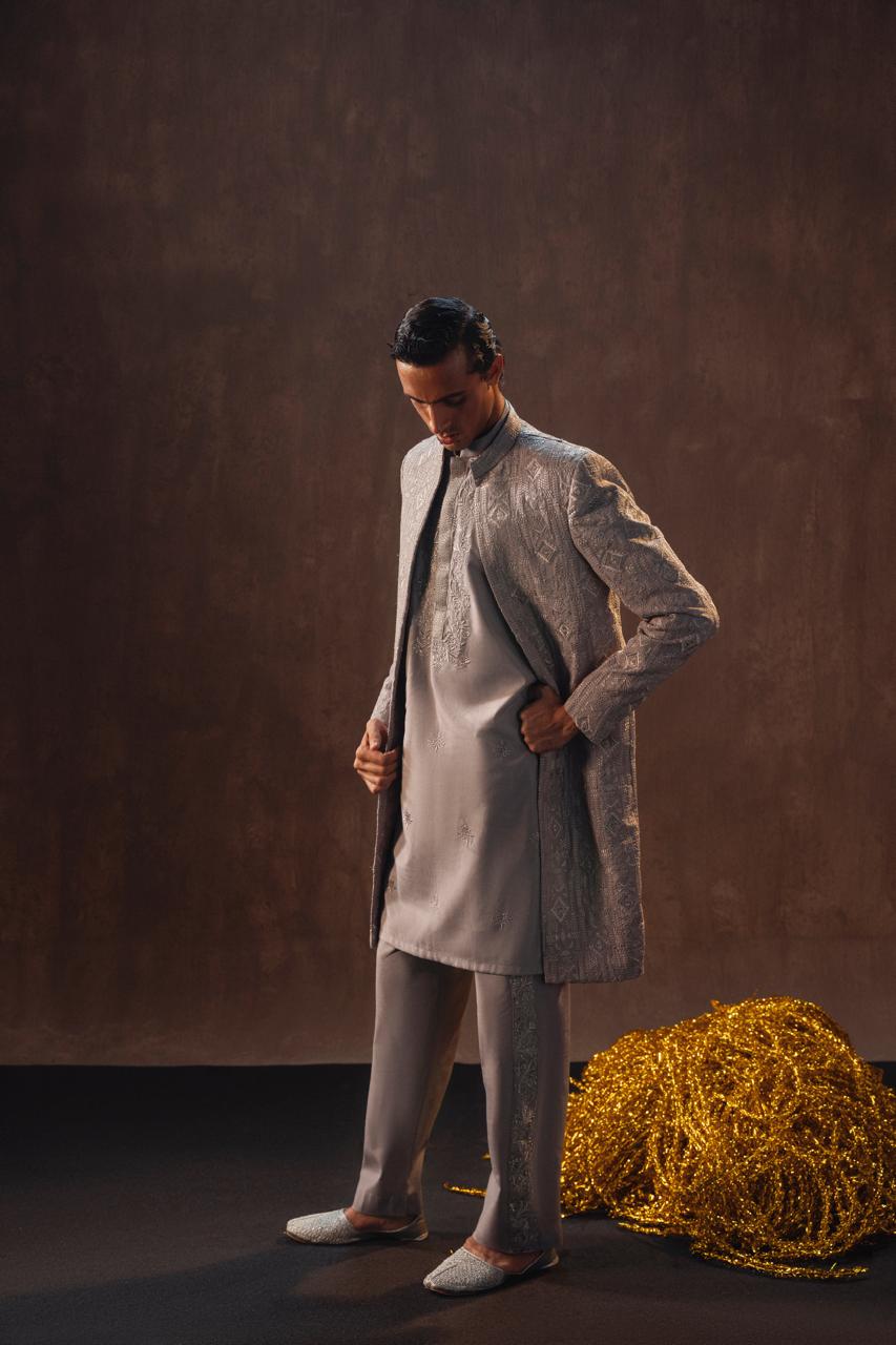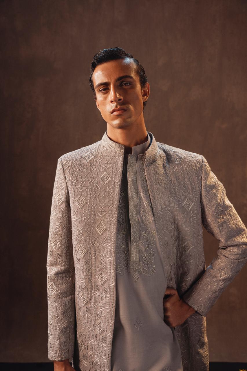 Light Grey Open Silk Sherwani delicately embroidered with matching thread and a touch of tilla for a subtle yet regal finish.