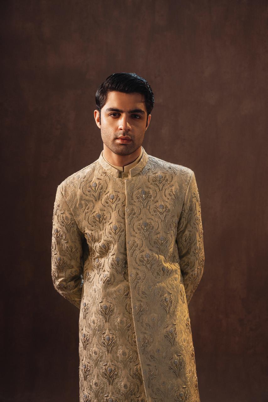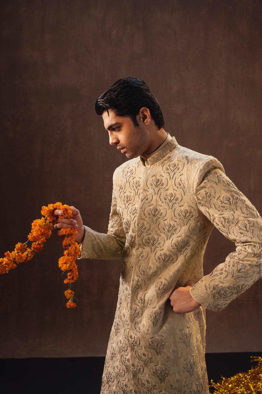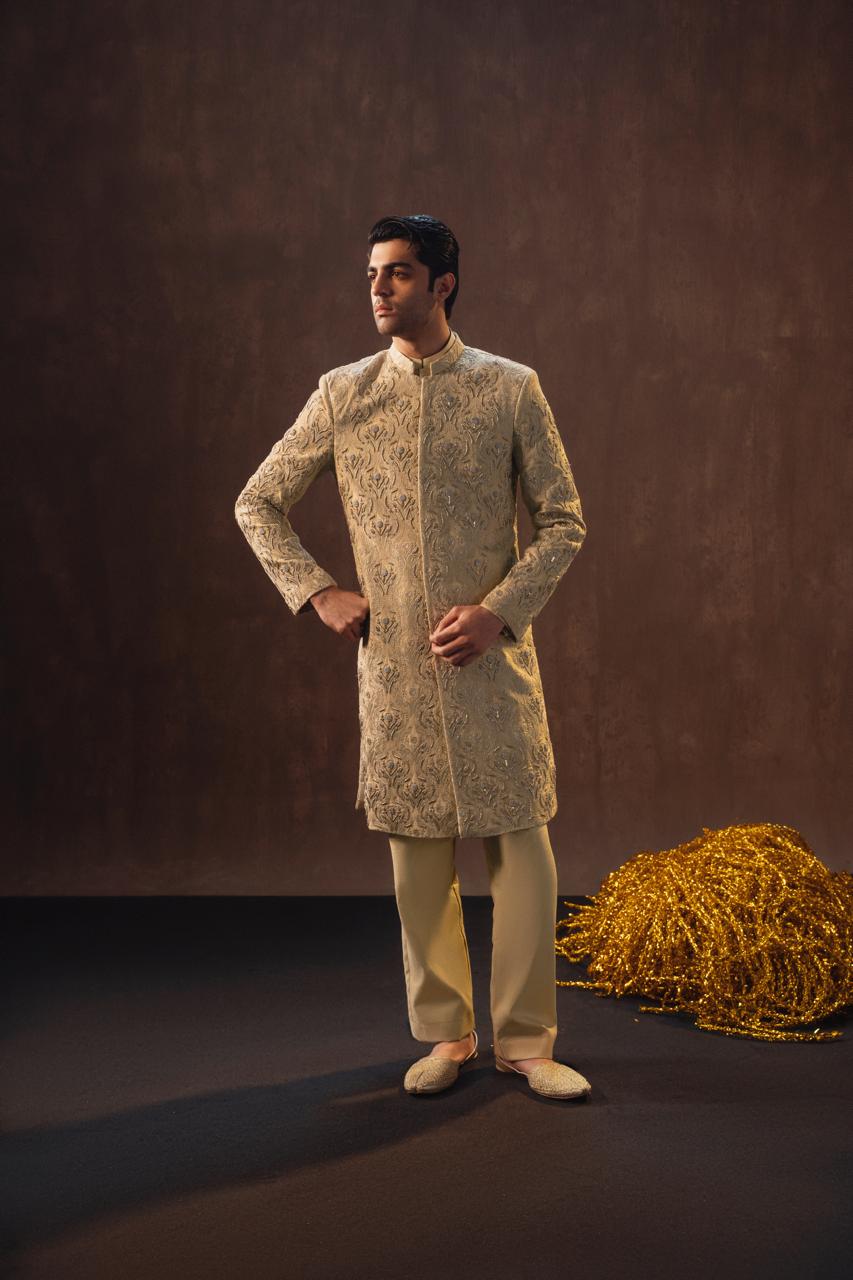 Light Gold Silk Sherwani exquisitely embroidered with elegant patterns in matching thread and GOLD tilla.