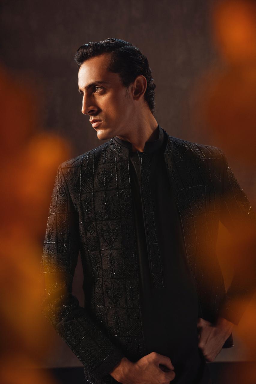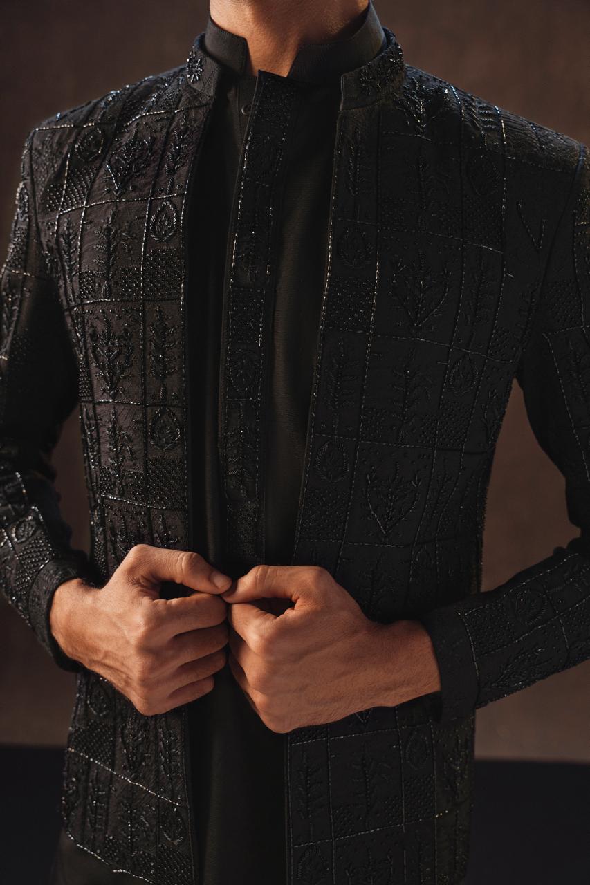 legantly designed with self-black thread embroidery and intricate embellishments of cutdana, dapka, and moti.