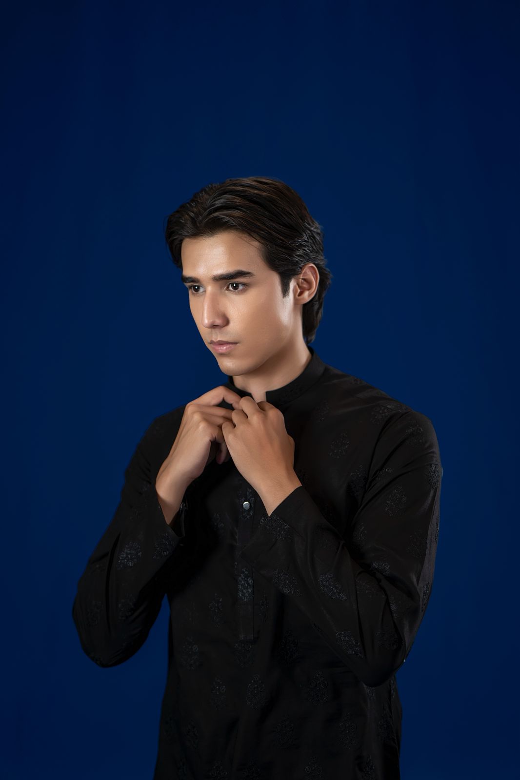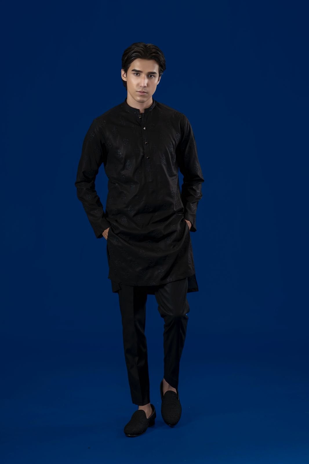 black cotton kurta pajama embroidered with the same thread design is a classic, versatile choice that exudes elegance and can be styled for various events. Since black is timeless and sophisticated, this outfit can easily be dressed up or down depending on accessories and footwear.