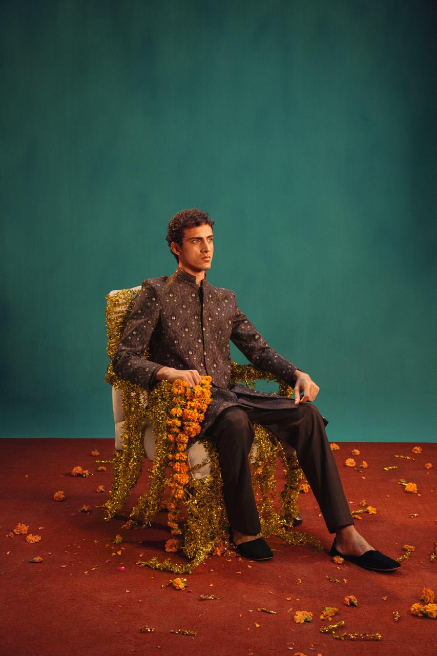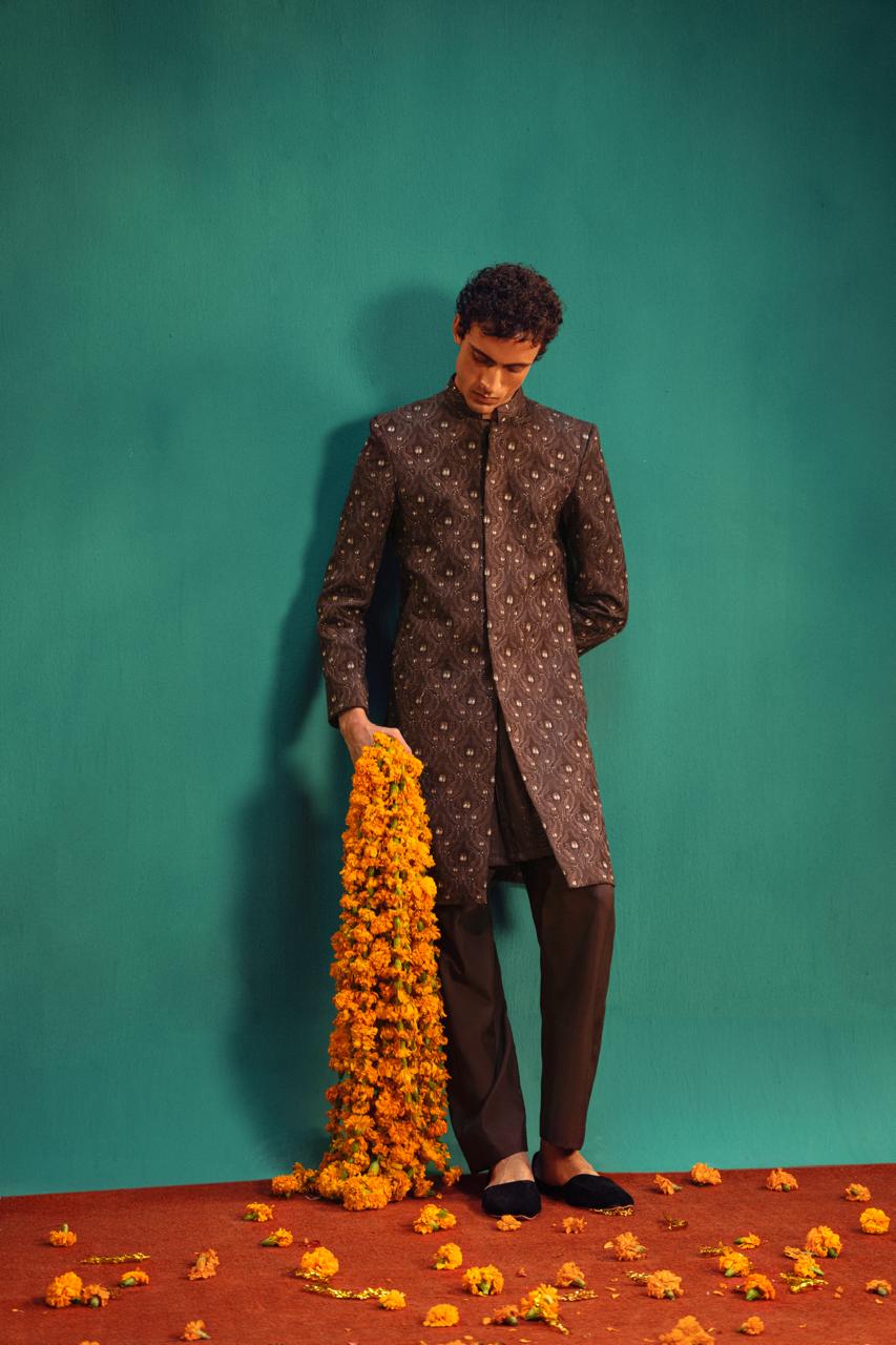 A rich brown silk sherwani, adorned with same-tone thread embroidery enhanced by light gold tilla. The refined pattern creates a graceful and elegant look, perfect for a dignified appearance on your special day