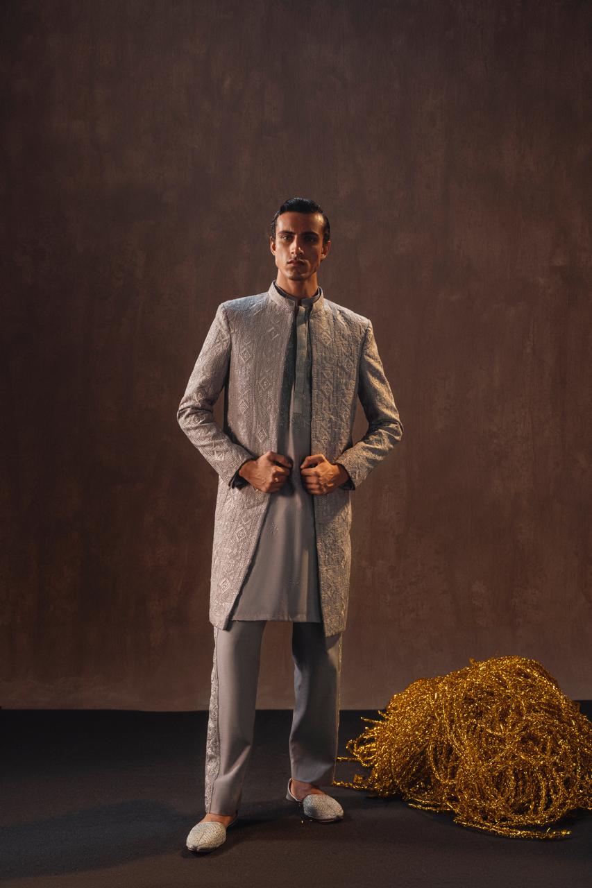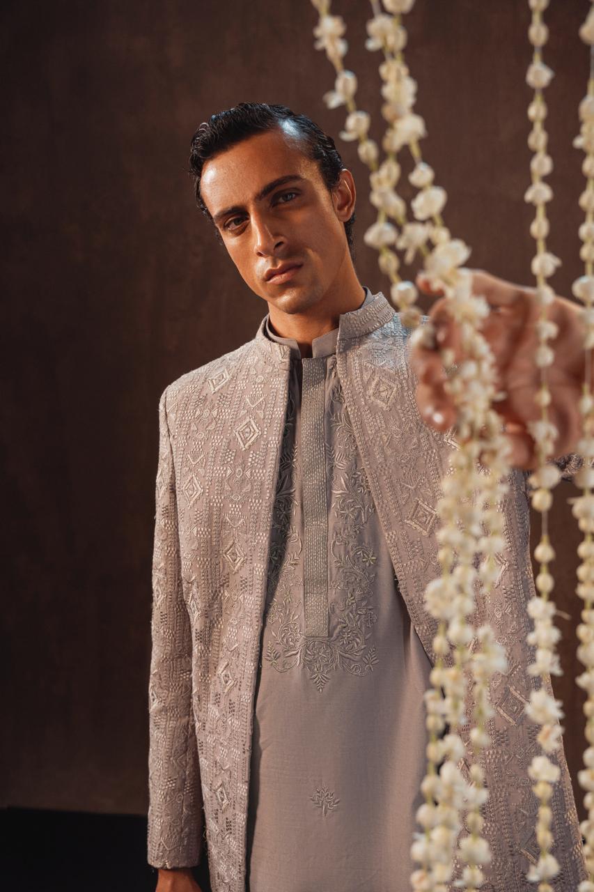 Light Grey Open Silk Sherwani delicately embroidered with matching thread and a touch of tilla for a subtle yet regal finish.
