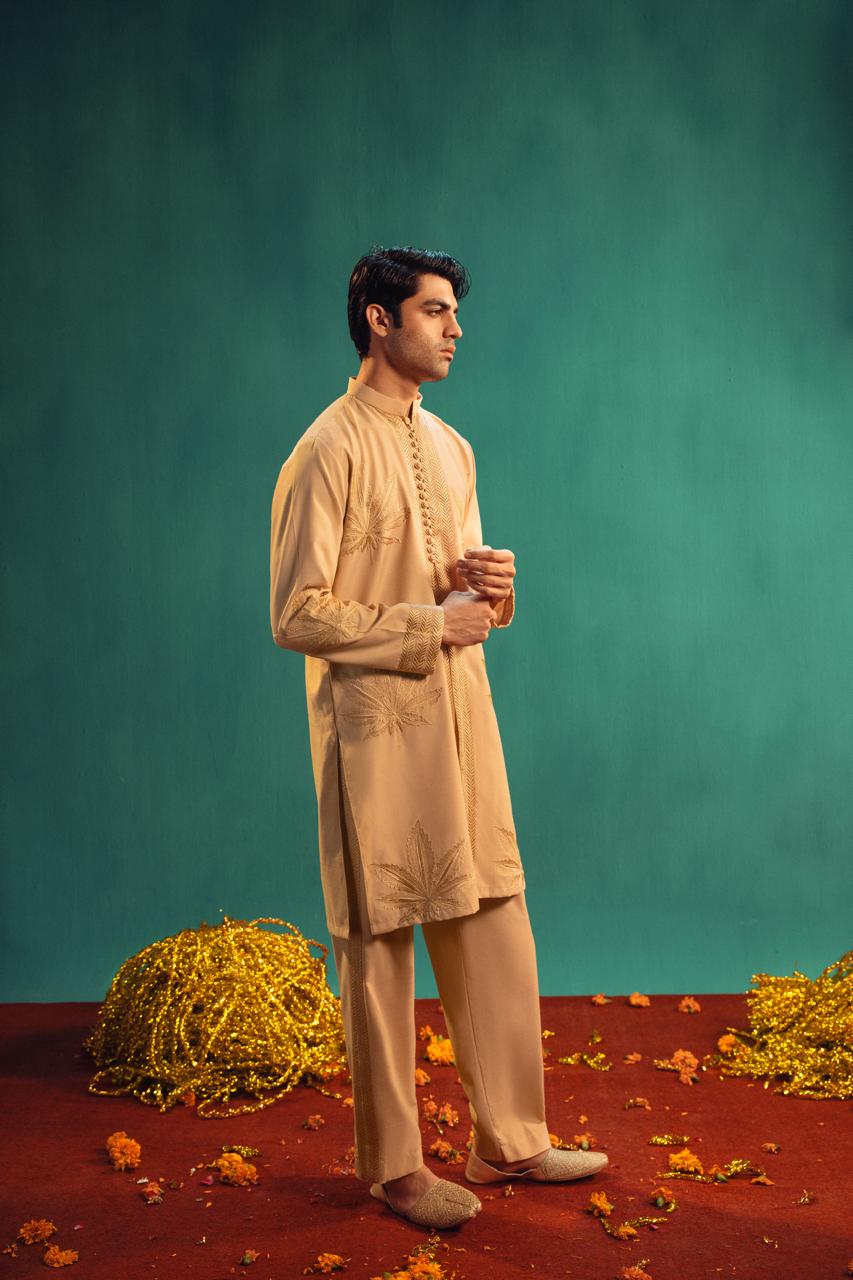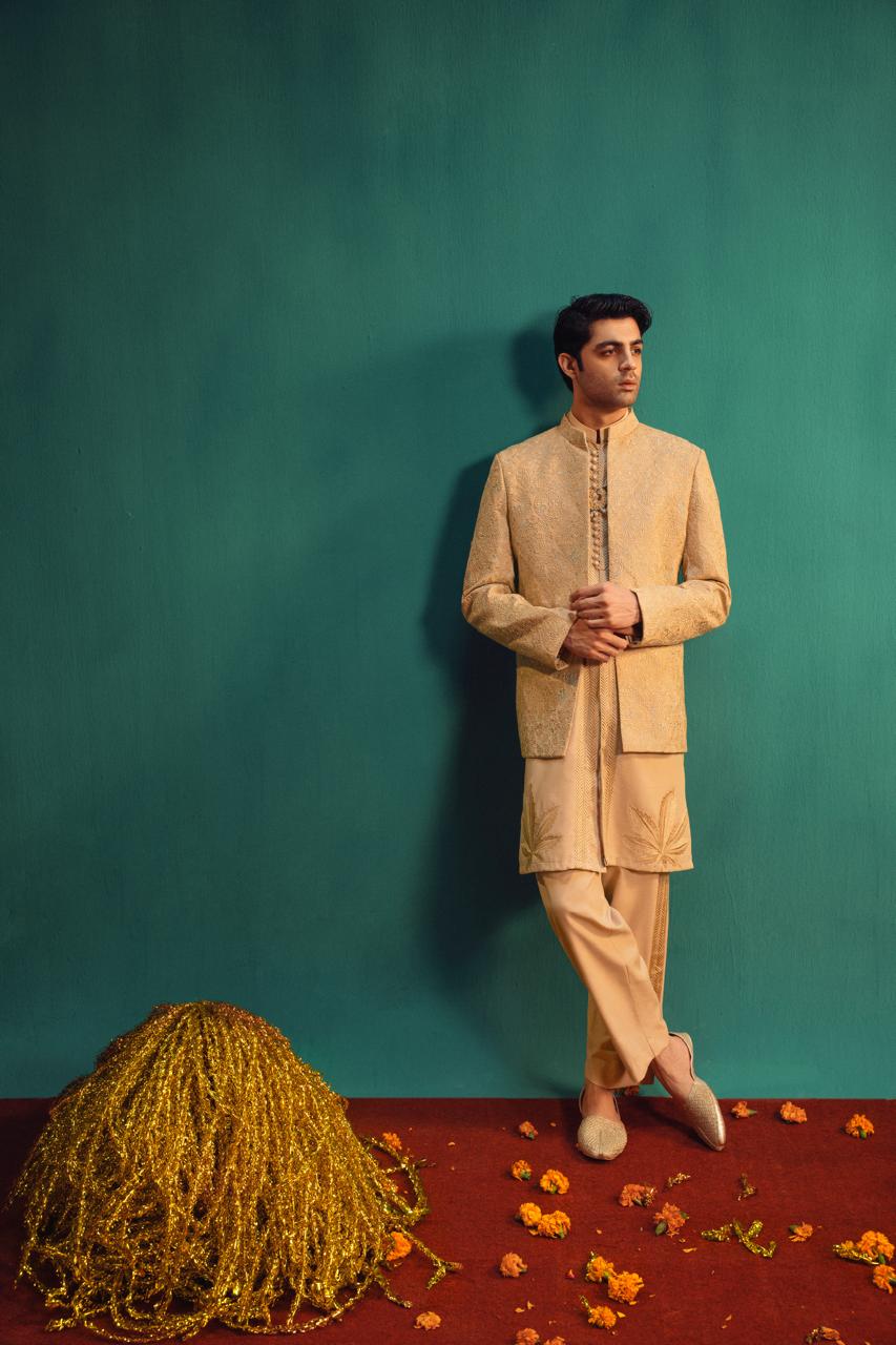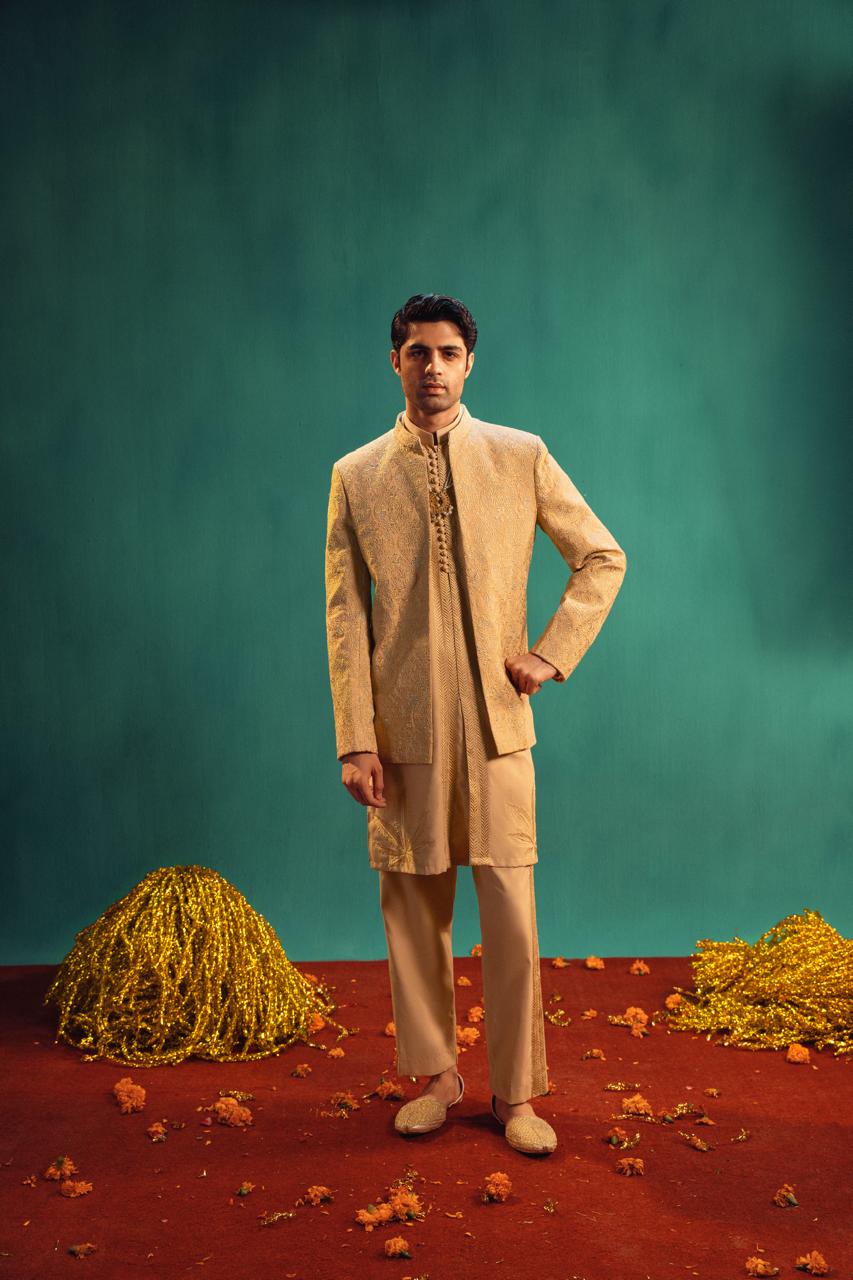 An elegant GOLDEN SILK coat, beautifully embroidered with same-tone thread and highlighted with LIGHT GOLD tila for a subtle yet rich contrast. The coat is paired with a silk kurta, stitched in an open-front style featuring delicate loop buttons cascading along the entire front. Slit embroidery in matching thread enhances the kurta, adding refinement and timeless grace to the ensemble