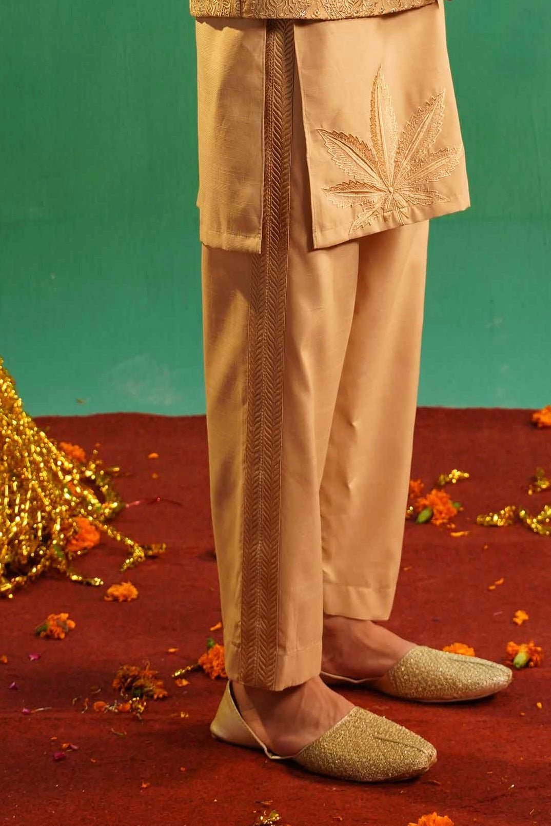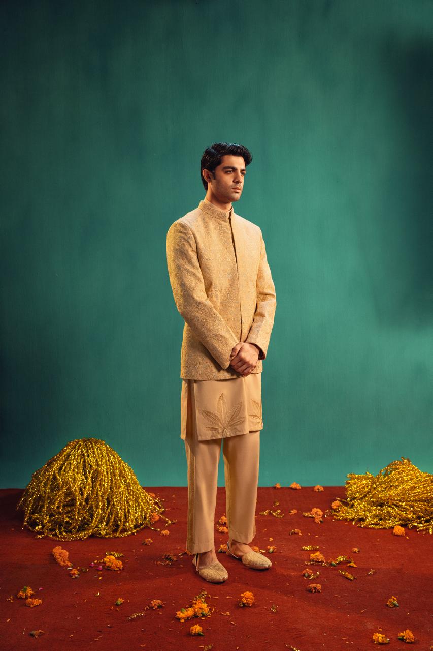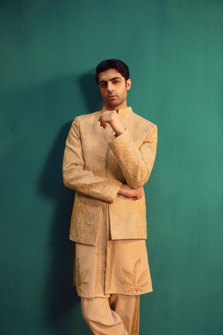 An elegant GOLDEN SILK coat, beautifully embroidered with same-tone thread and highlighted with LIGHT GOLD tila for a subtle yet rich contrast. The coat is paired with a silk kurta, stitched in an open-front style featuring delicate loop buttons cascading along the entire front. Slit embroidery in matching thread enhances the kurta, adding refinement and timeless grace to the ensemble
