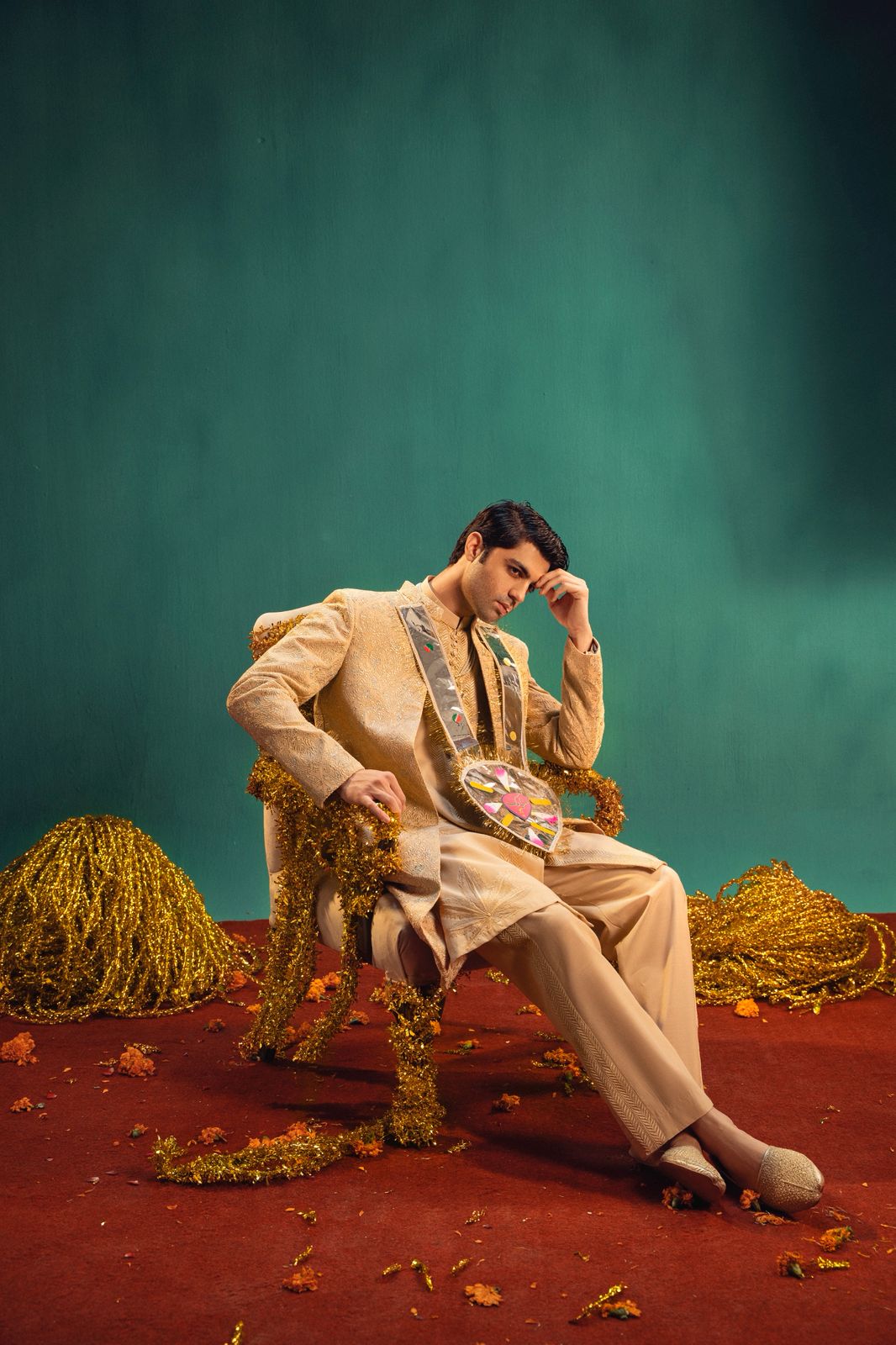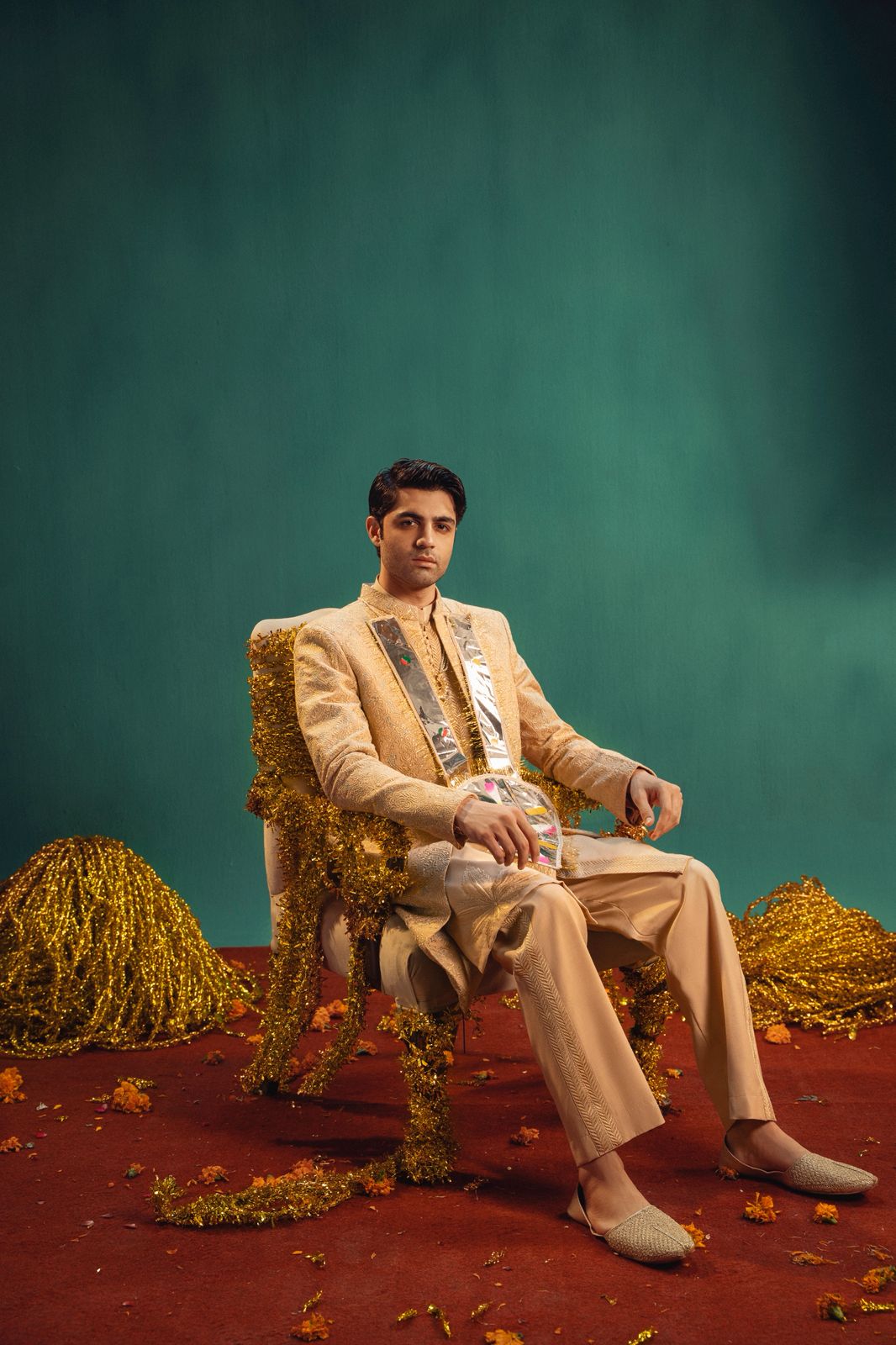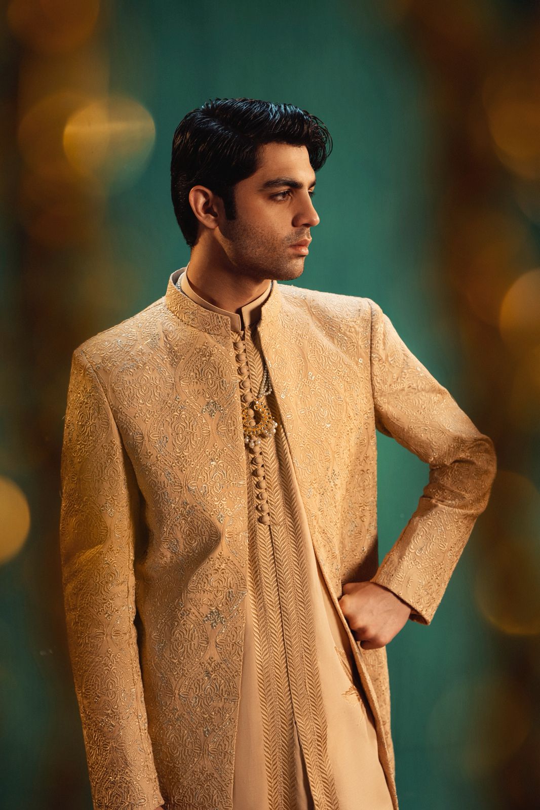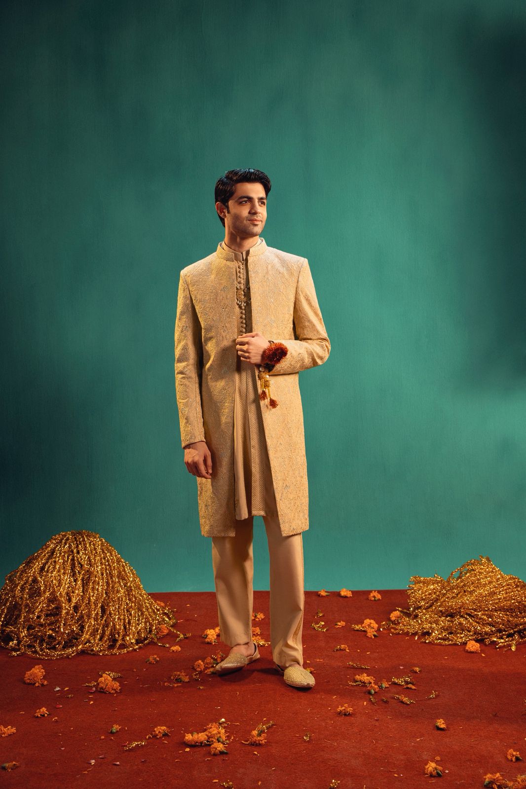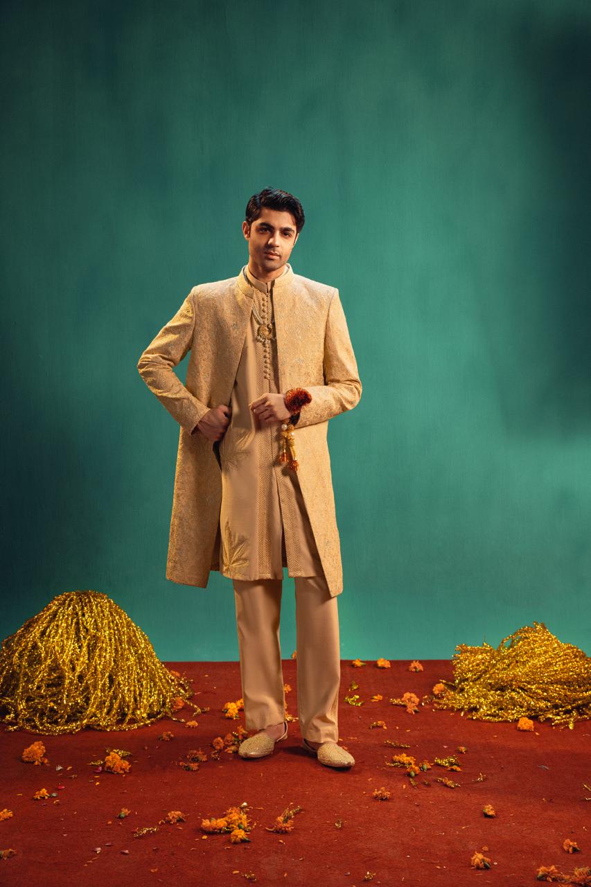 An elegant GOLDEN SILK fabric open sherwani, beautifully embroidered with same-tone thread and highlighted with LIGHT GOLD tila for a subtle yet rich contrast paired with luxurious golden silk front-open kurta pajama, tailored in a modern cut. Intricately embroidered with same-tone thread on the shirt front, sleeves, and along the sides of the trousers, this design adds a regal touch, making the trousers look exceptionally royal