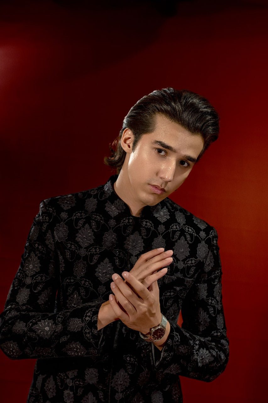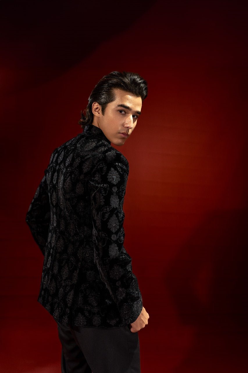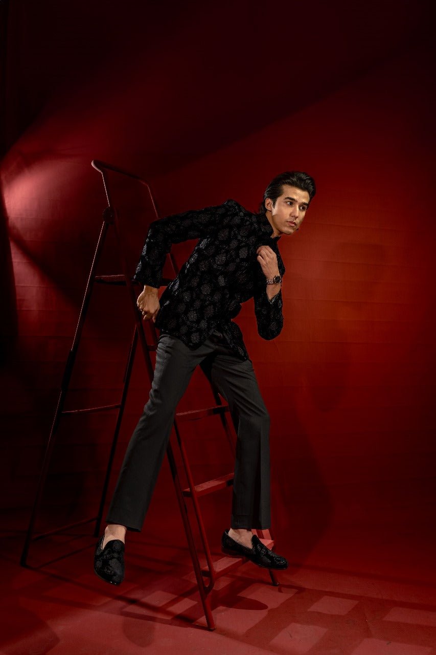 The black velvet prince coat with intricate black thread embroidery adds a regal and luxurious touch. The prince coat style typically features a fitted design and often has a slightly longer cut, which contributes to an elegant silhouette. Regular suiting pants in black will keep the look polished and cohesive.This outfit is perfect for formal events, wedding