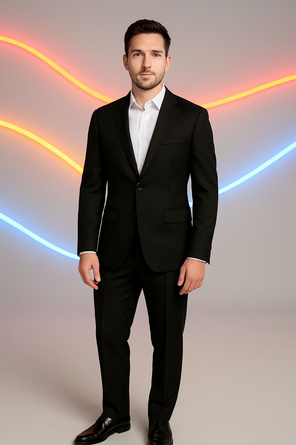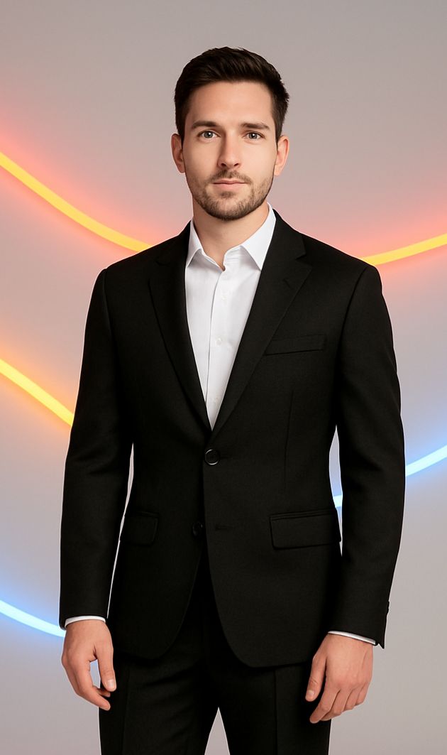 COAT : Single-breasted with two buttons, slim-fit style, featuring flap pockets and a chest pocket