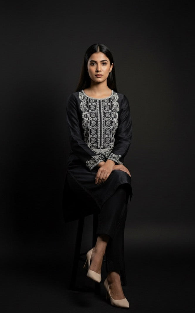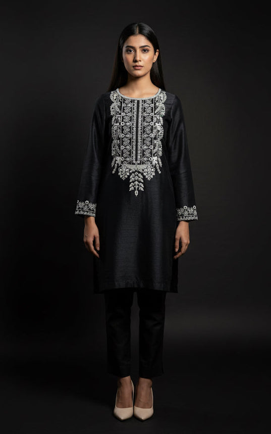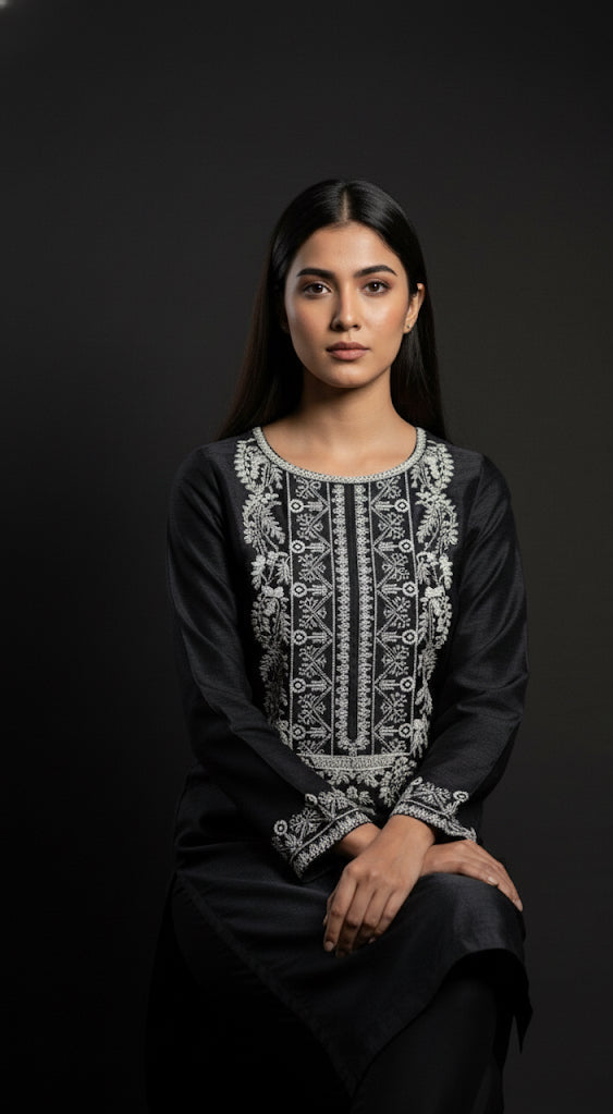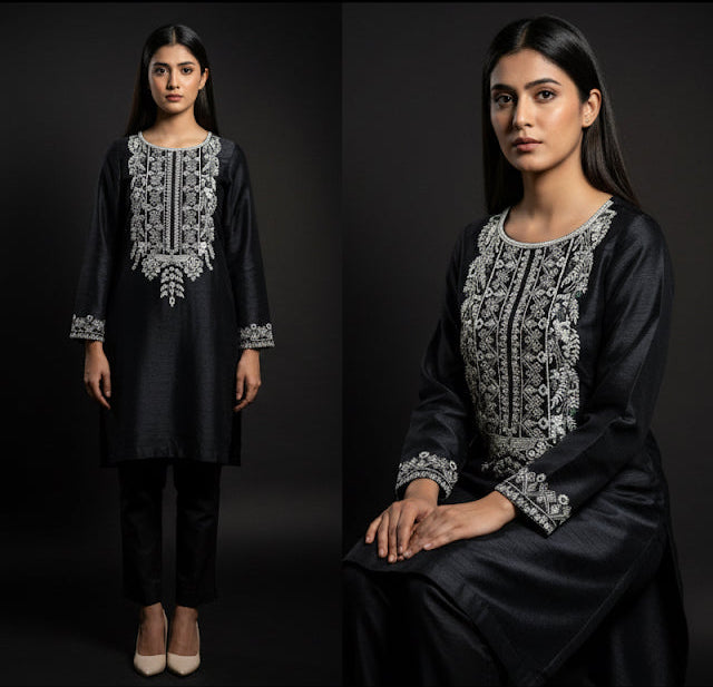 A stunning BLACK silk shirt, beautifully adorned with luxurious handwork featuring moti, crystals, sirtā, and fine thread embroidery. The neckline showcases an elegant, heavily detailed motif that flows gracefully across the chest, while the sleeves are designed in the same intricate pattern, creating a perfectly balanced and premium look.