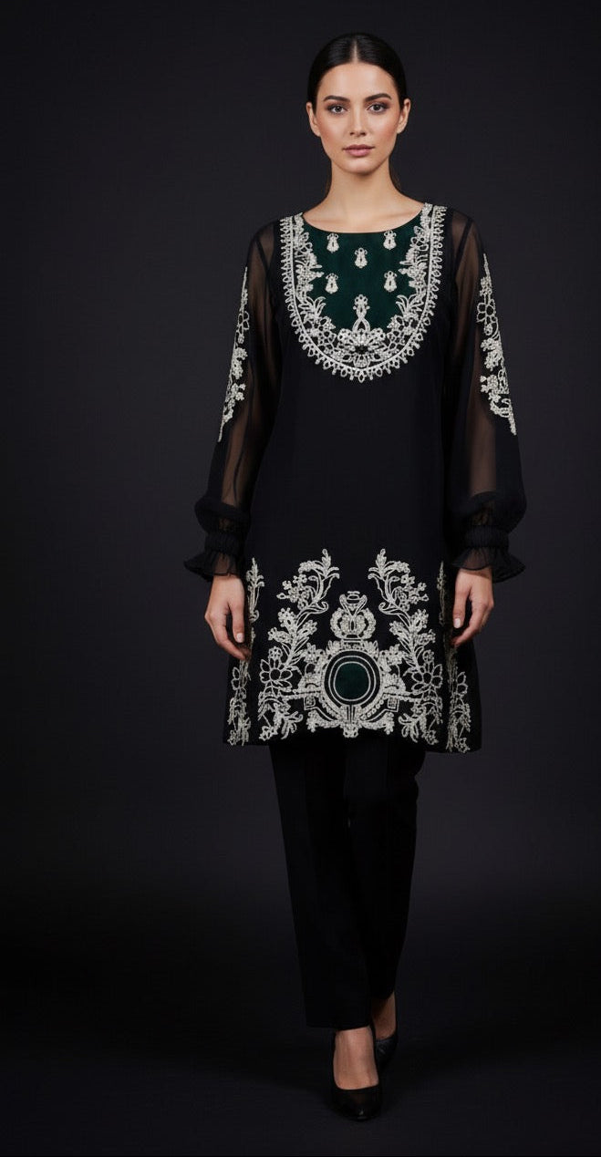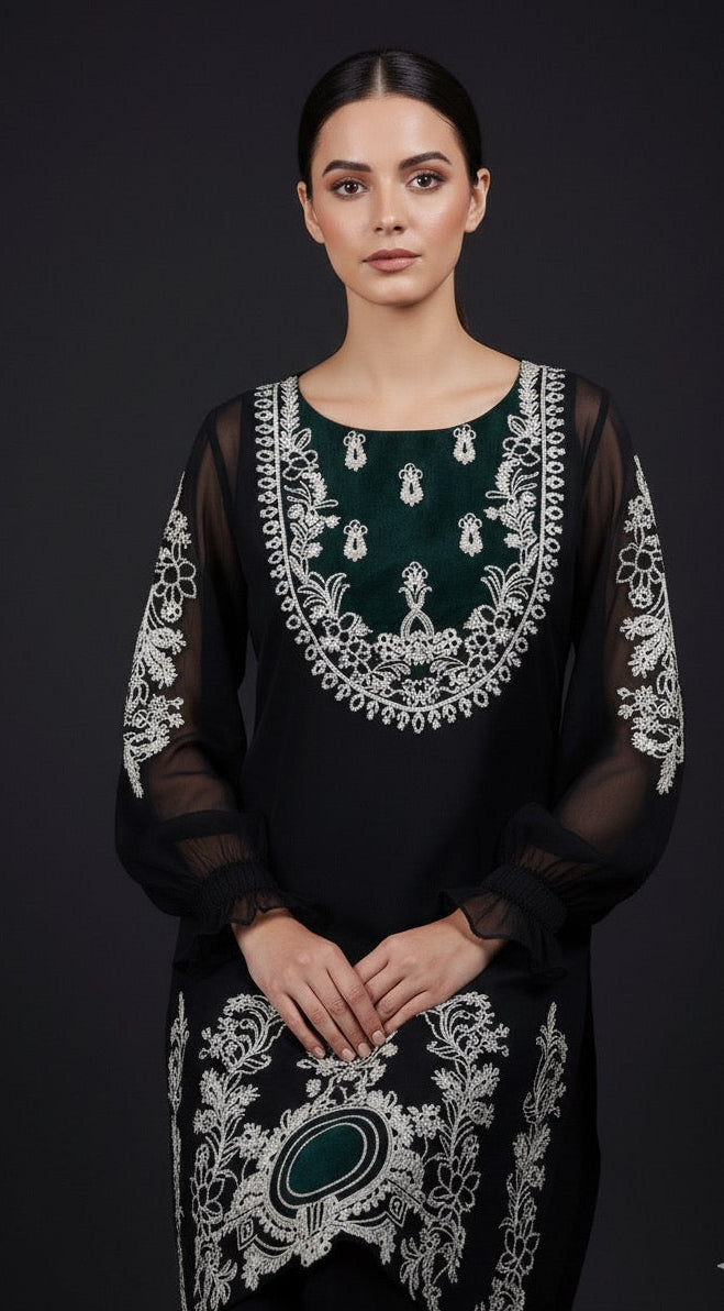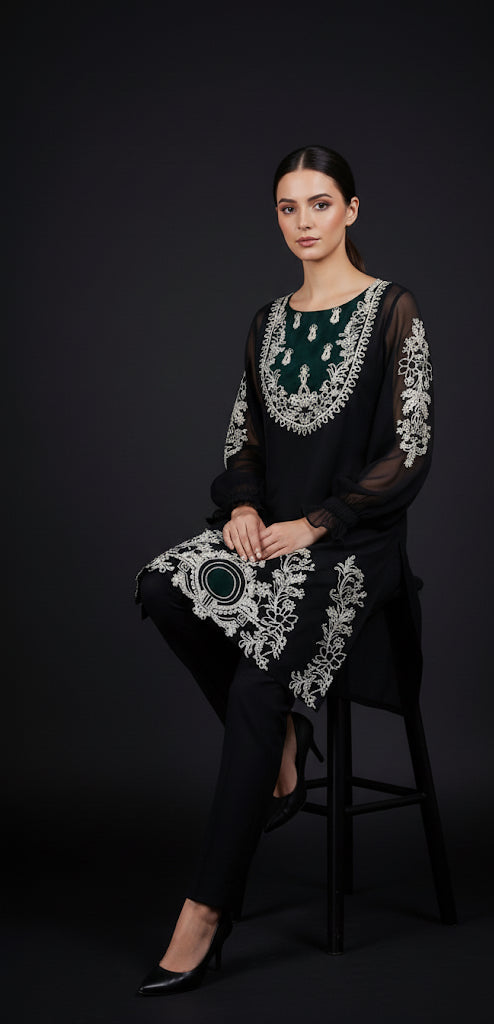A timeless black organza shirt beautifully enhanced with handcrafted pitta work, contrasted elegantly with touches of green fabric detailing that elevate the overall design. The intricate handwork adds depth, shine, and a luxurious festive appeal, making the outfit stand out effortlessly.