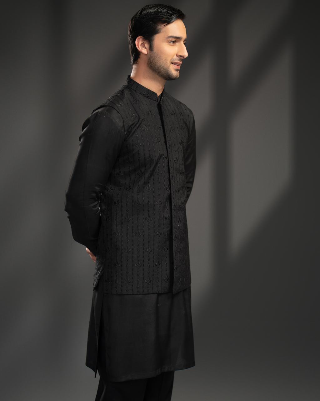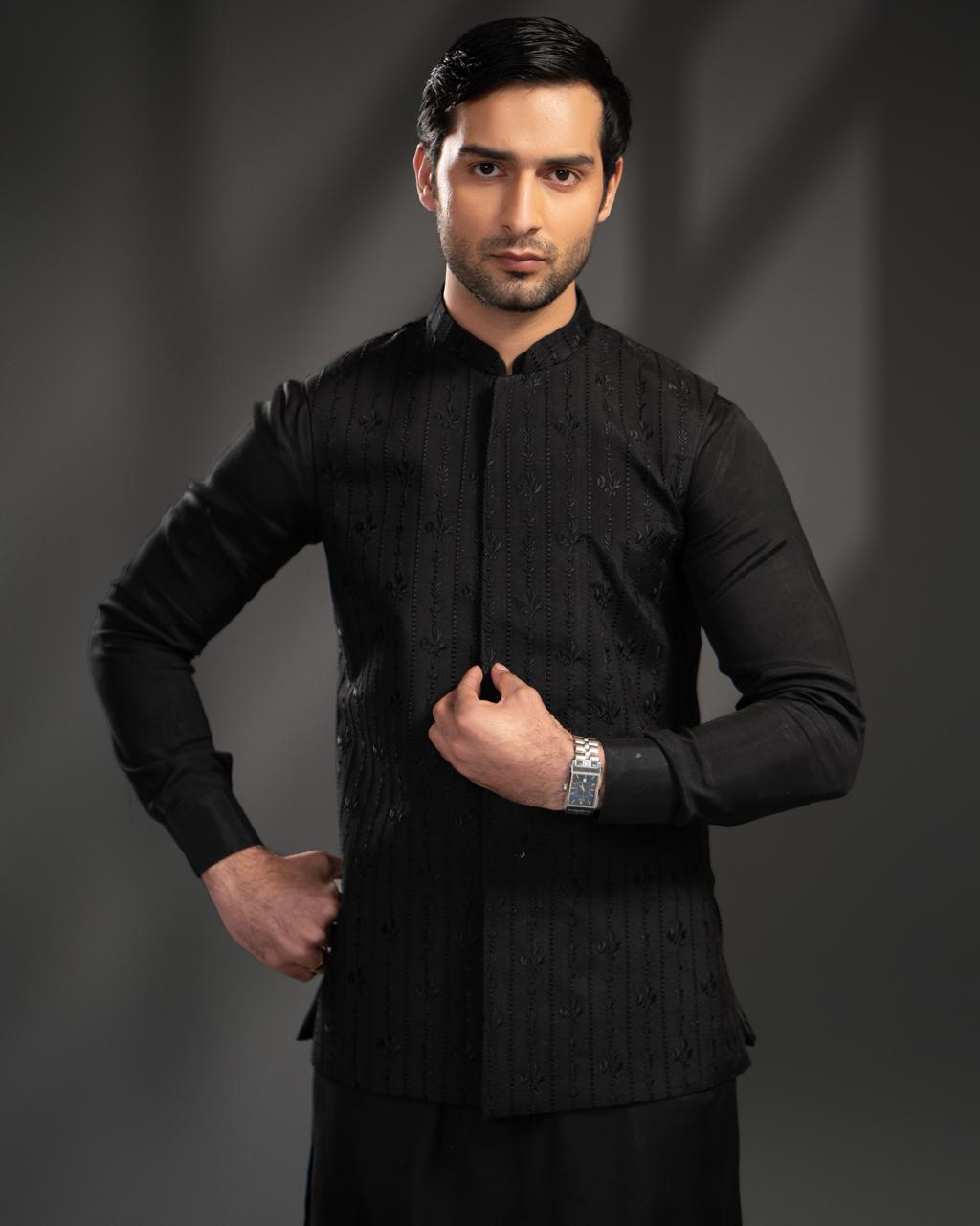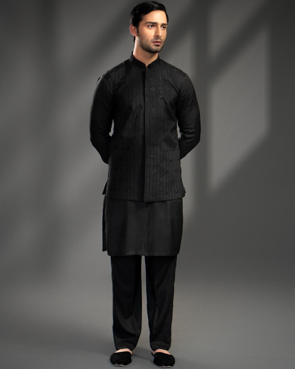 This outfit is a traditional South Asian men’s formal look, styled in a black color