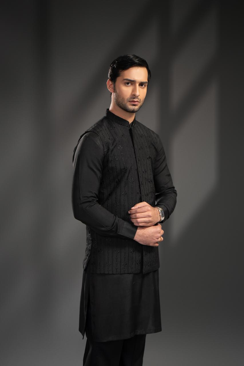 The sleeveless waistcoat is the highlight of the outfit. It features self-textured embroidery in the same black shade, adding depth and luxury without using contrasting colours