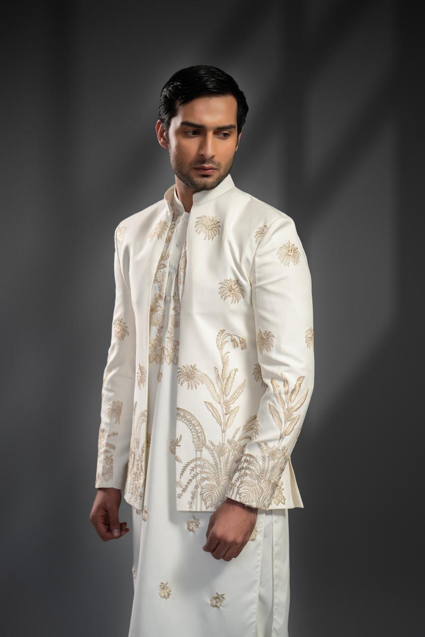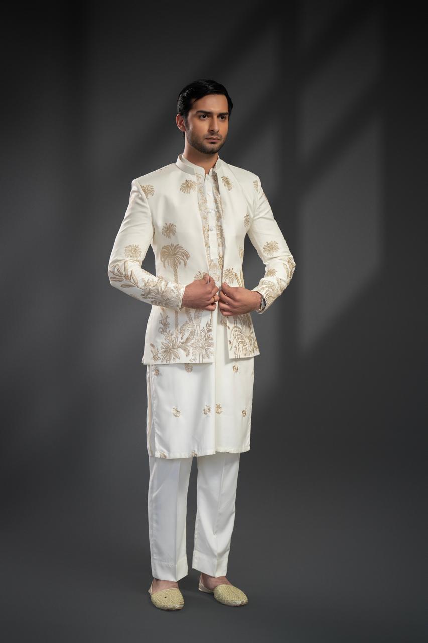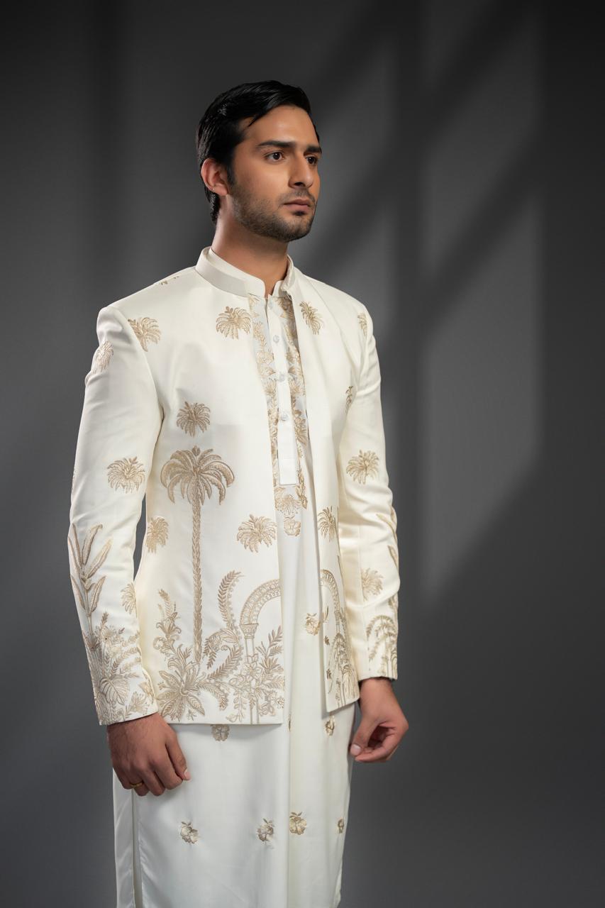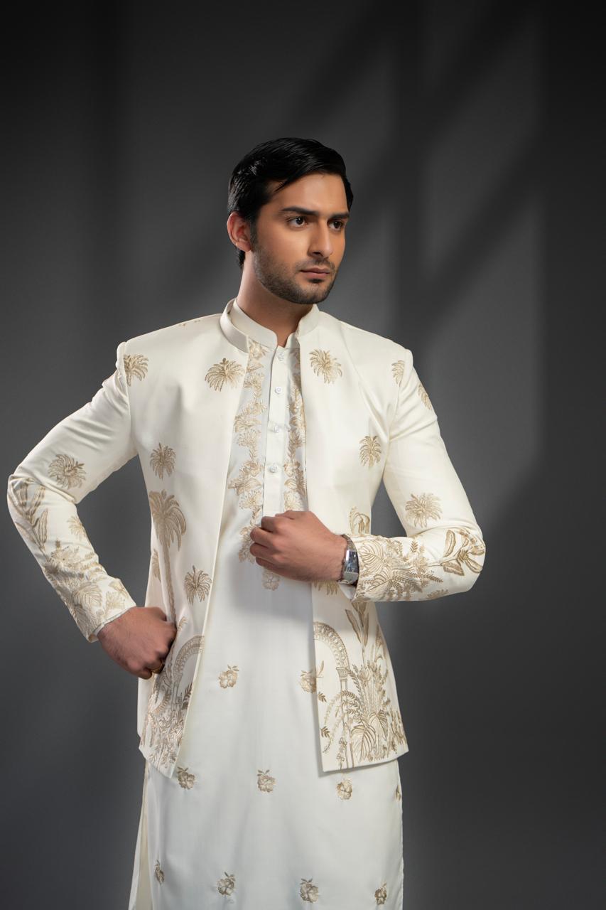 Experience understated opulence with this exquisitely crafted cream wash & wear ensemble, designed for the discerning gentleman. The open prince coat is adorned with refined beige thread embroidery in a rich cultural motif, offering a graceful blend of tradition and contemporary elegance.