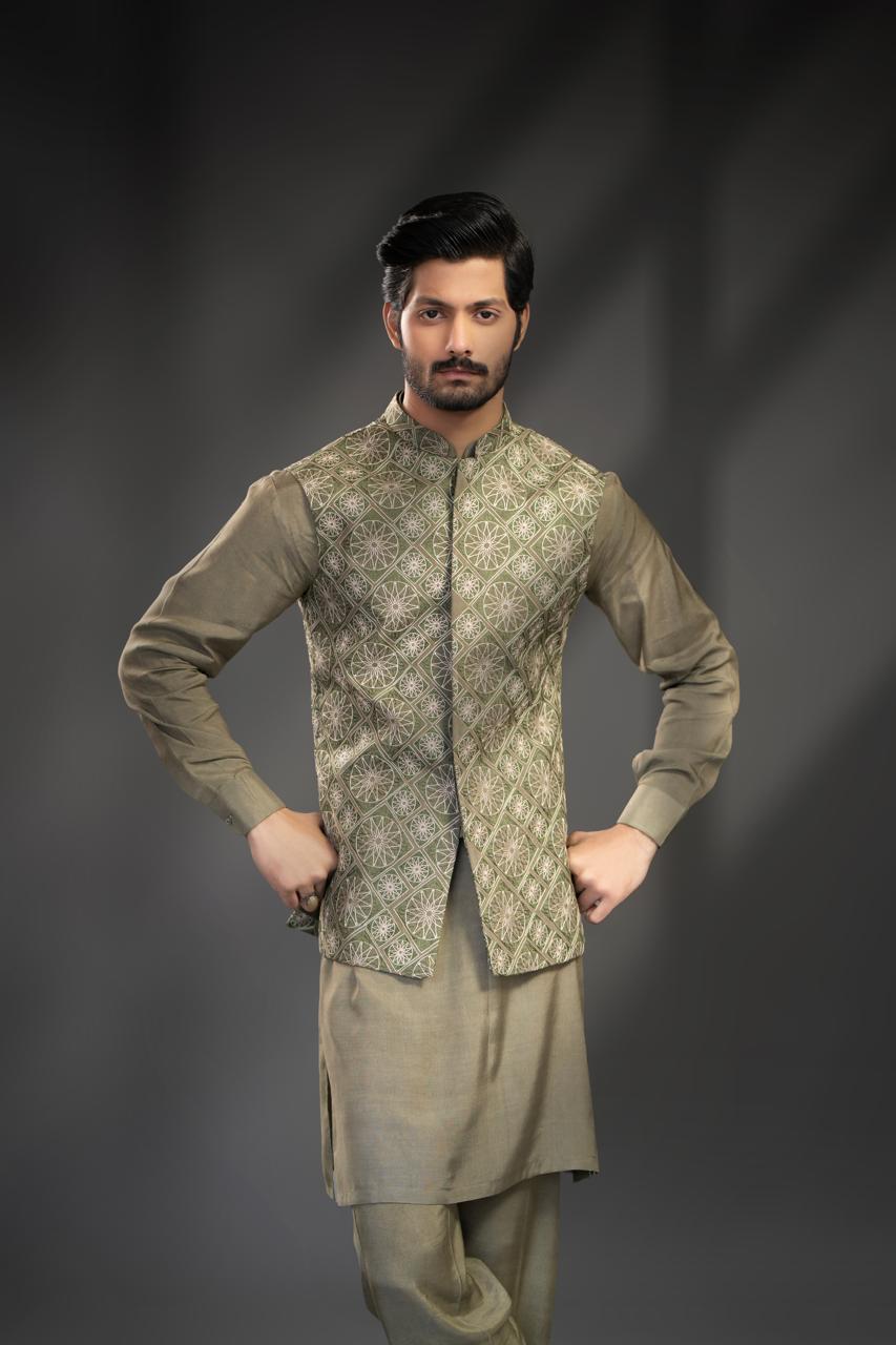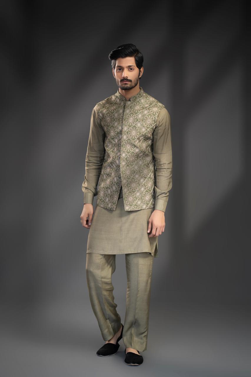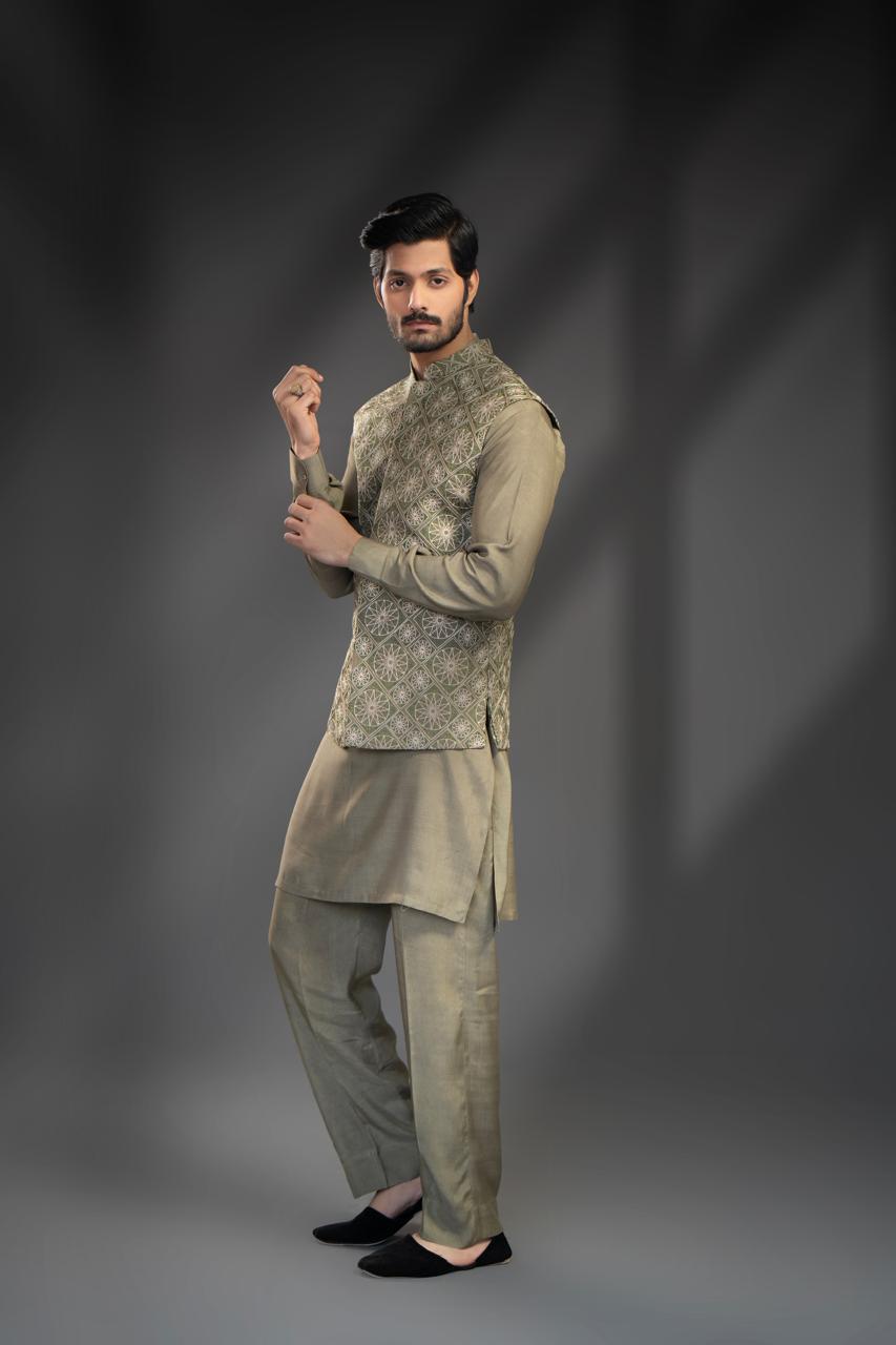 Olive green silk waistcoat set, crafted from premium fabric and adorned with intricate embroidery in matching thread with subtle light-green detailing. Paired with a classic olive green silk kurta and straight-fitted pajama, this ensemble delivers a timeless and sophisticated look. Perfect for weddings, Eid, and all formal occasions.